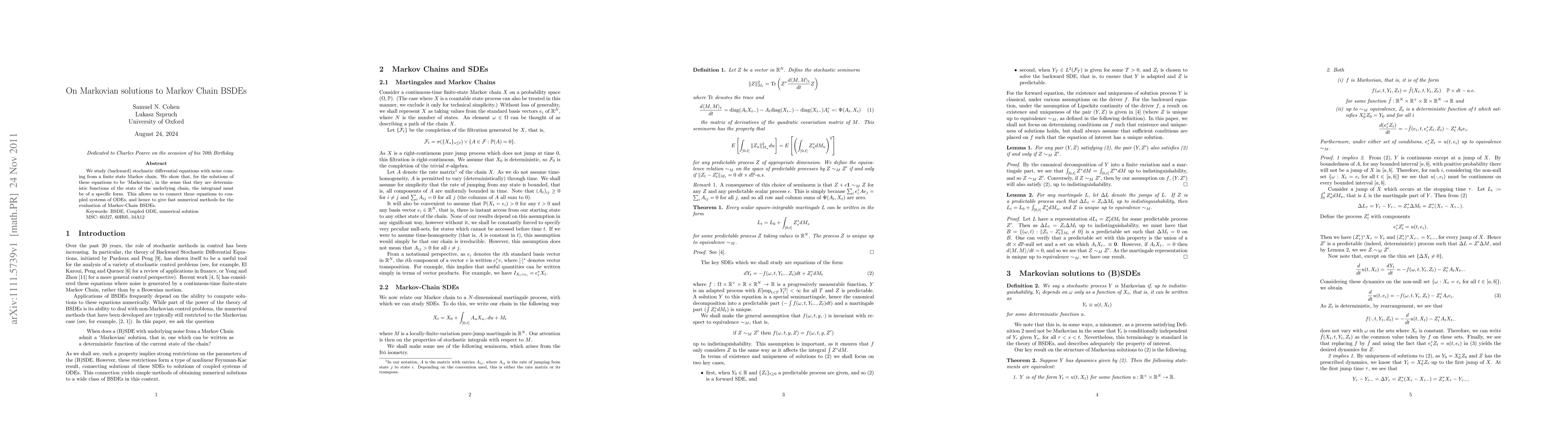 We study (backward) stochastic differential equations with noise coming from a finite state Markov chain. We show that, for the solutions of these equations to be `Markovian', in the sense that they are deterministic functions of the state of the underlying chain, the integrand must be of a specific form. This allows us to connect these equations to coupled systems of ODEs, and hence to give fast numerical methods for the evaluation of Markov-Chain BSDEs.