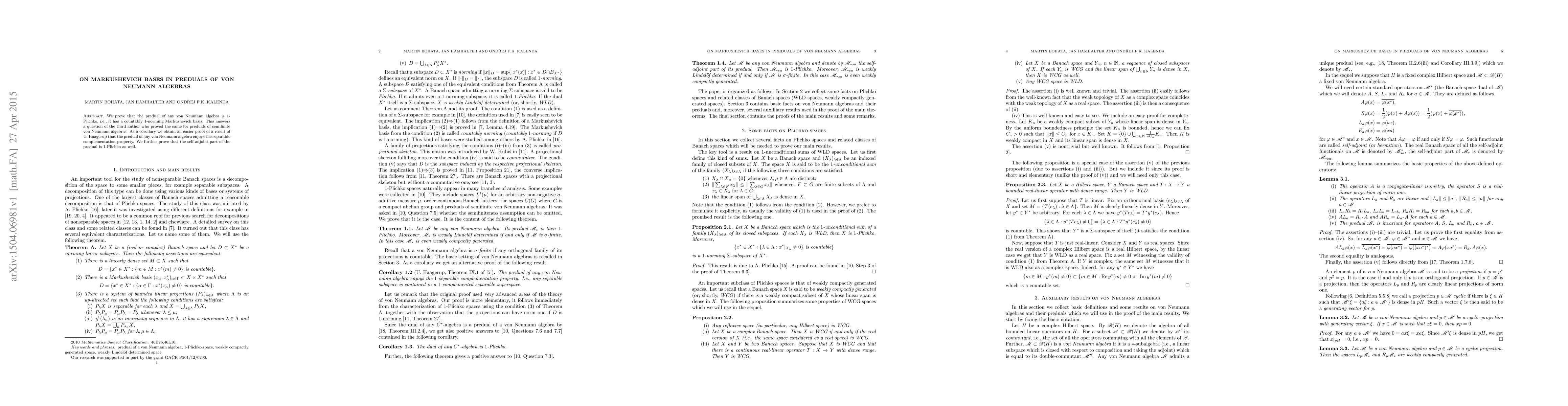 The paper proves the existence of a countably $1$-norming Markushevich basis in the predual of any von Neumann algebra, thereby addressing a question previously answered only for semifinite von Neumann algebras. As a corollary, it provides a simpler proof for Haagerup's result on the separable complementation property in such preduals.