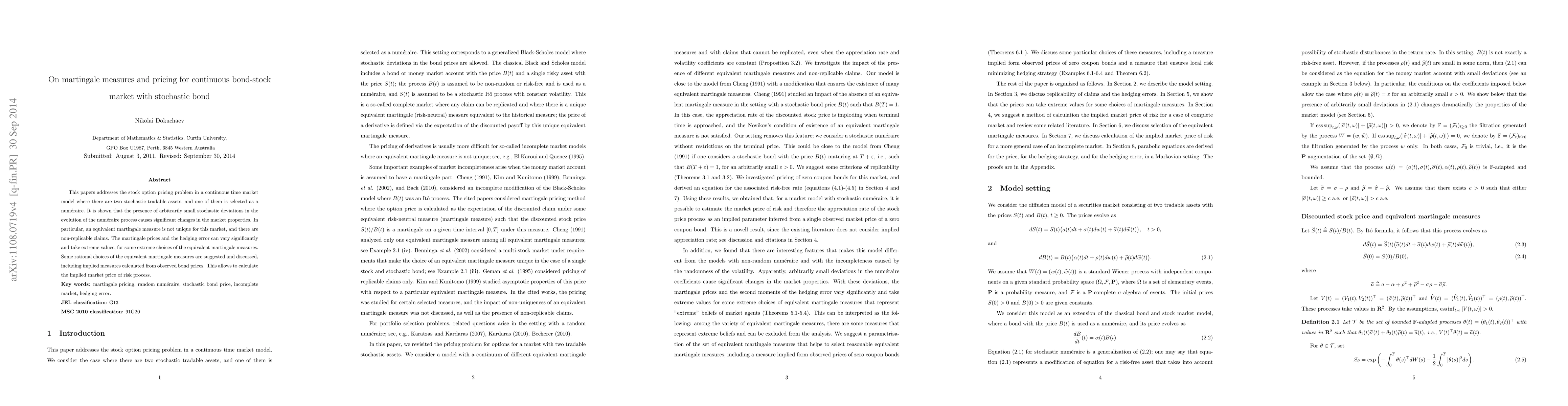 This paper explores the pricing of stock options in a continuous-time market model with two stochastic assets, where minor stochastic variations in the numéraire lead to non-unique martingale measures and non-replicable claims. It suggests rational equivalent martingale measures, including those derived from bond prices, to calculate the implied market price of risk.