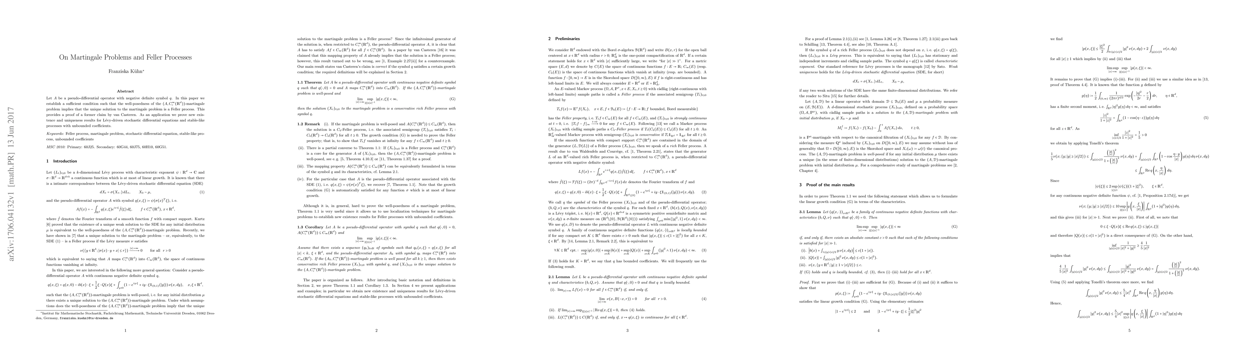 Let $A$ be a pseudo-differential operator with negative definite symbol $q$. In this paper we establish a sufficient condition such that the well-posedness of the $(A,C_c^{\infty}(\mathbb{R}^d))$-martingale problem implies that the unique solution to the martingale problem is a Feller process. This provides a proof of a former claim by van Casteren. As an application we prove new existence and uniqueness results for L\'evy-driven stochastic differential equations and stable-like processes with unbounded coefficients.