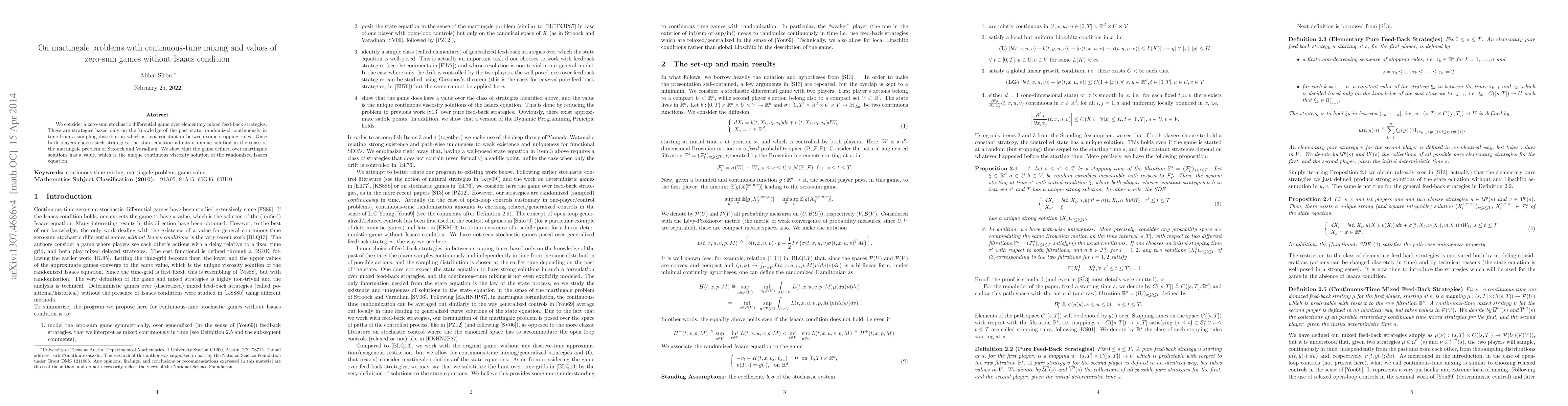 The paper analyzes a zero-sum stochastic differential game using continuous-time mixing strategies, focusing on elementary mixed feedback strategies that are randomized continuously in time from a sampling distribution. It establishes conditions under which the state equation has a unique solution in the martingale problem sense.