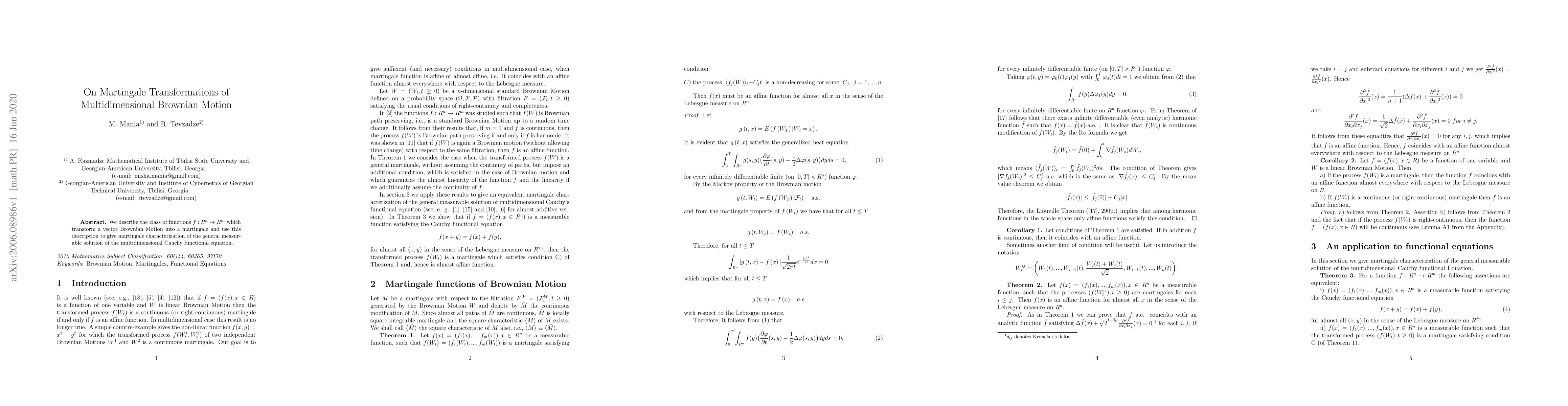 We describe the class of functions $f: R^n\to R^m$ which transform a vector Brownian Motion into a martingale and use this description to give martingale characterization of the general measurable solution of the multidimensional Cauchy functional equation.
