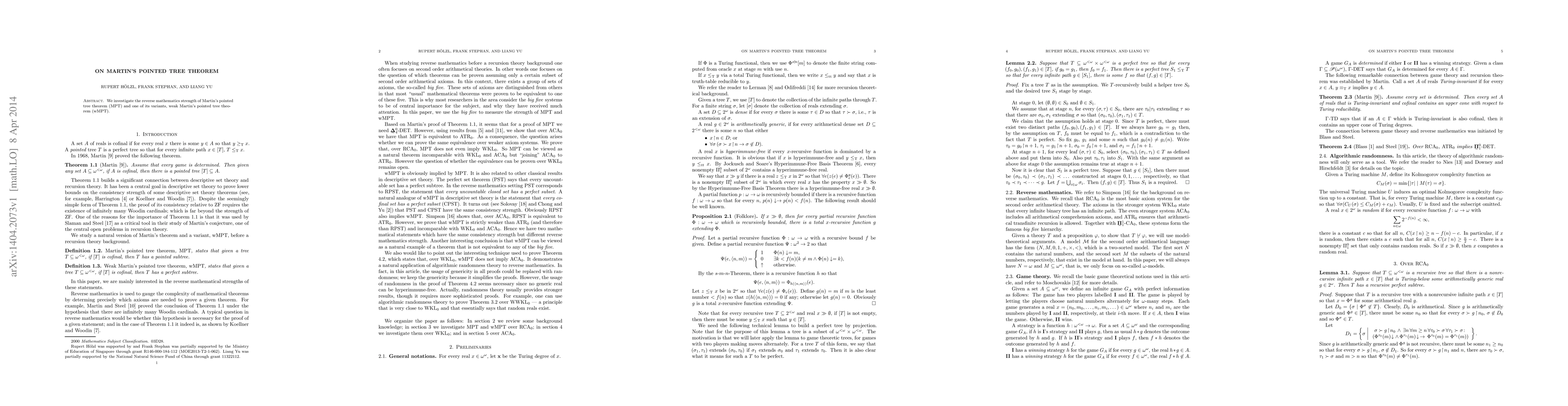 Summary: This paper examines the reverse mathematics strength of Martin's pointed tree theorem (MPT) and its weaker variant (wMPT), assessing their foundational implications in mathematical logic.