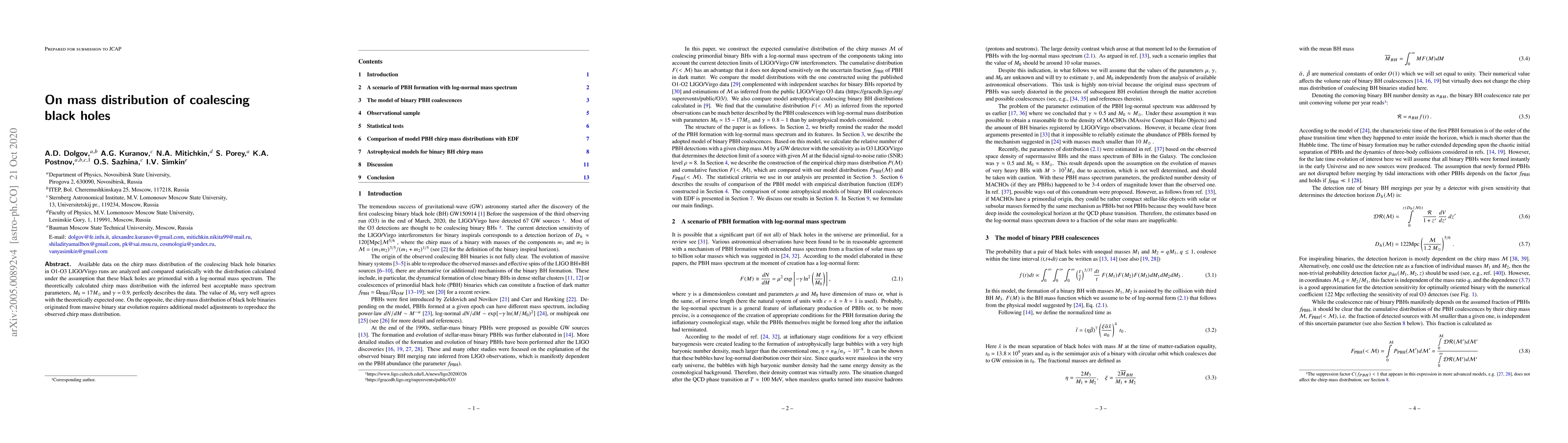 This paper analyzes LIGO/Virgo data on coalescing black hole binaries, finding that a log-normal mass spectrum with parameters $M_0=17 M_\odot$ and $\gamma=0.9$ accurately describes the observed chirp mass distribution, supporting the hypothesis of primordial black holes. In contrast, the distribution from massive binary star evolution requires additional adjustments.