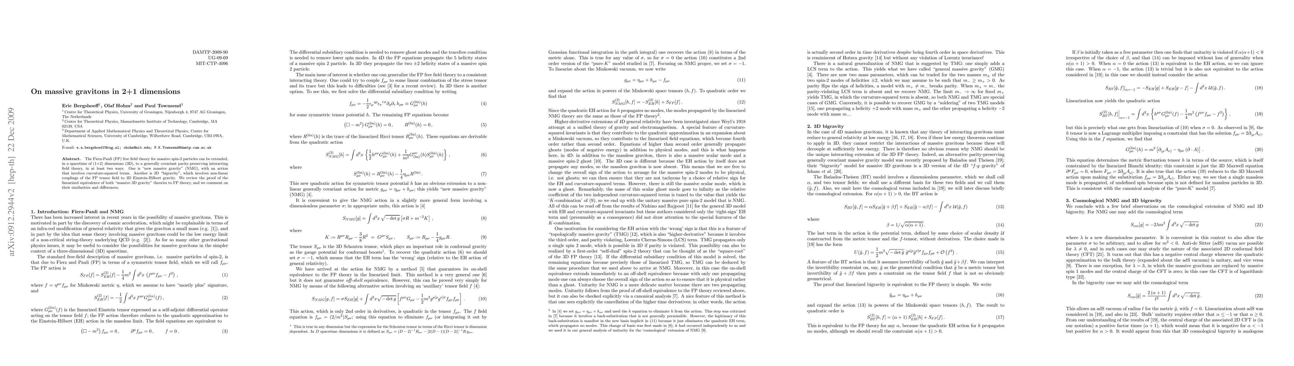 The Fierz-Pauli (FP) free field theory for massive spin 2 particles can be extended, in a spacetime of (1+2) dimensions (3D), to a generally covariant parity-preserving interacting field theory, in at least two ways. One is "new massive gravity" (NMG), with an action that involves curvature-squared terms. Another is 3D "bigravity", which involves non-linear couplings of the FP tensor field to 3D Einstein-Hilbert gravity. We review the proof of the linearized equivalence of both "massive 3D gravity" theories to FP theory, and we comment on their similarities and differences.
