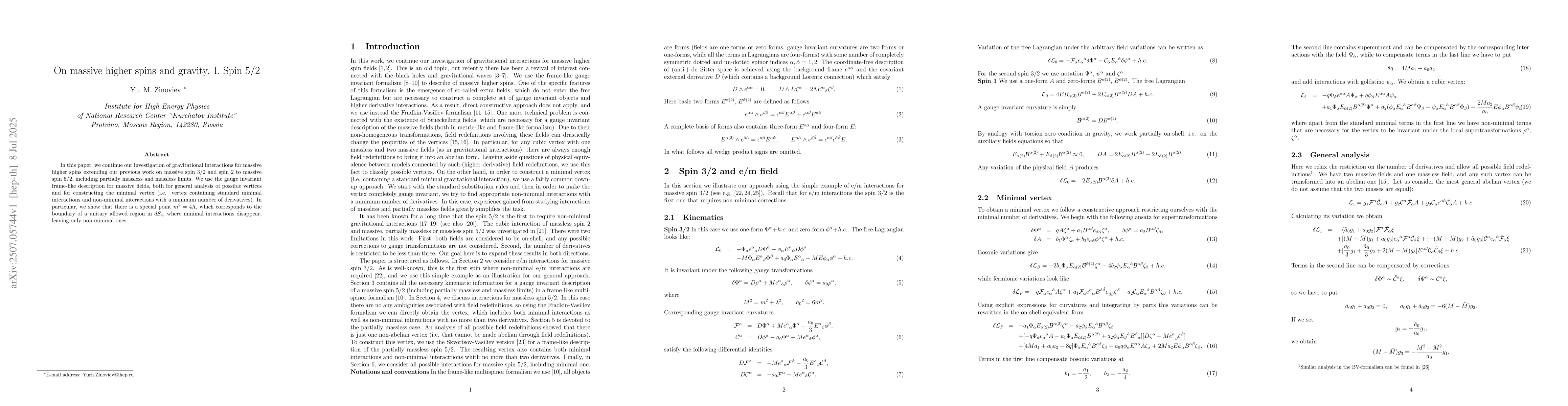 In this paper, we continue our investigation of gravitational interactions for massive higher spins extending our previous work on massive spin 3/2 and spin 2 to massive spin 5/2, including partially massless and massless limits. We use the gauge invariant frame-like description for massive fields, both for general analysis of possible vertices and for constructing the minimal vertex (i.e. vertex containing standard minimal interactions and non-minimal interactions with a minimum number of derivatives). In particular, we show that there is a special point m^2 = 4\Lambda, which corresponds to the boundary of a unitary allowed region in dS_4, where minimal interactions disappear, leaving only non-minimal ones.