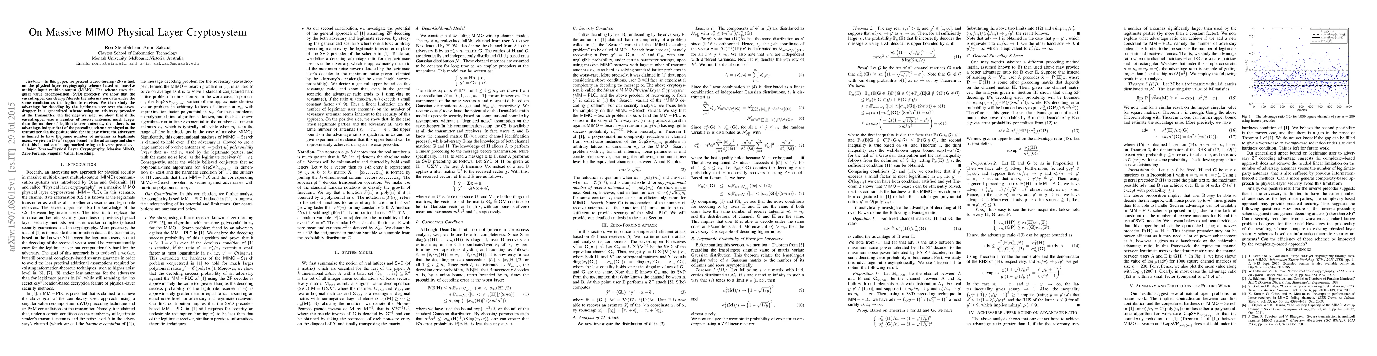 The paper introduces a ZF attack on massive MIMO physical layer cryptosystems and provides an upper bound on the decoding advantage for legitimate users over eavesdroppers under specific conditions.