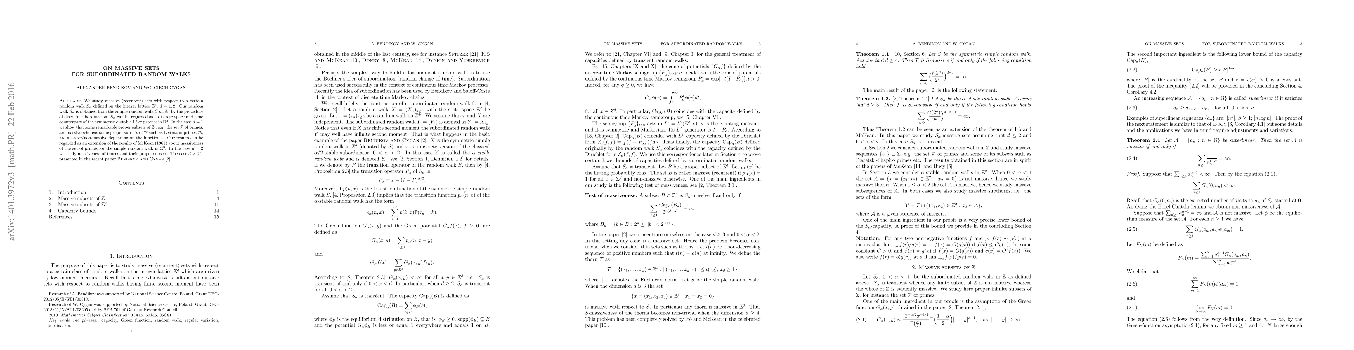 We study massive (reccurent) sets with respect to a certain random walk $S_\alpha $ defined on the integer lattice $\mathbb{Z} ^d$, $d=1,2$. Our random walk $S_\alpha $ is obtained from the simple random walk $S$ on $\mathbb{Z} ^d$ by the procedure of discrete subordination. $S_\alpha $ can be regarded as a discrete space and time counterpart of the symmetric $\alpha $-stable L\'{e}vy process in $\mathbb{R}^d$. In the case $d=1$ we show that some remarkable proper subsets of $\mathbb{Z}$ , e.g. the set $\mathcal{P}$ of primes, are massive whereas some proper subsets of $\mathcal{P}$ such as Leitmann primes $\mathcal{P}_h$ are massive/non-massive depending on the function $h$. Our results can be regarded as an extension of the results of McKean (1961) about massiveness of the set of primes for the simple random walk in $\mathbb{Z}^3$. In the case $d=2$ we study massiveness of thorns and their proper subsets.
