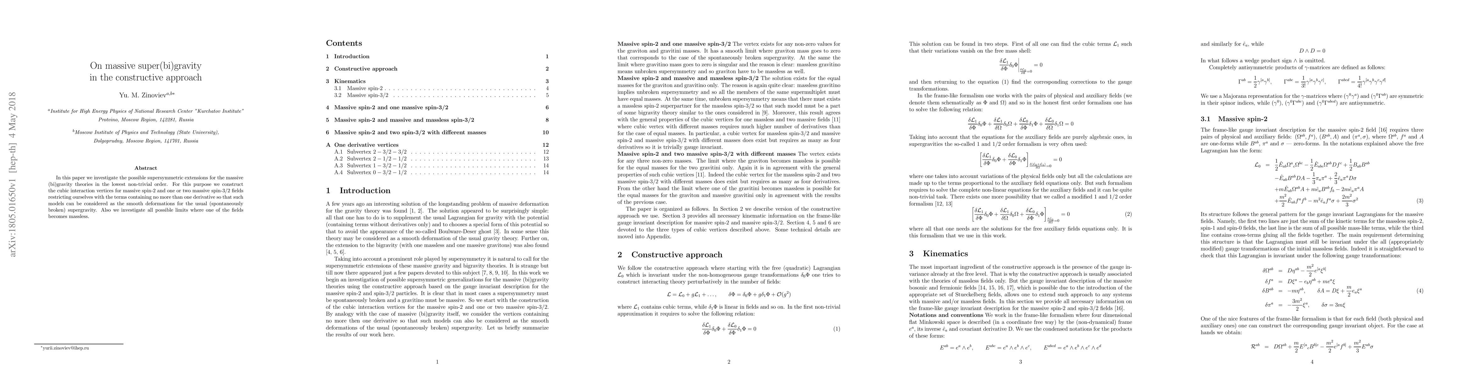 In this paper we investigate the possible supersymmetric extensions for the massive (bi)gravity theories in the lowest non-trivial order. For this purpose we construct the cubic interaction vertices for massive spin-2 and one or two massive spin-3/2 fields restricting ourselves with the terms containing no more than one derivative so that such models can be considered as the smooth deformations for the usual (spontaneously broken) supergravity. Also we investigate all possible limits where one of the fields becomes massless.