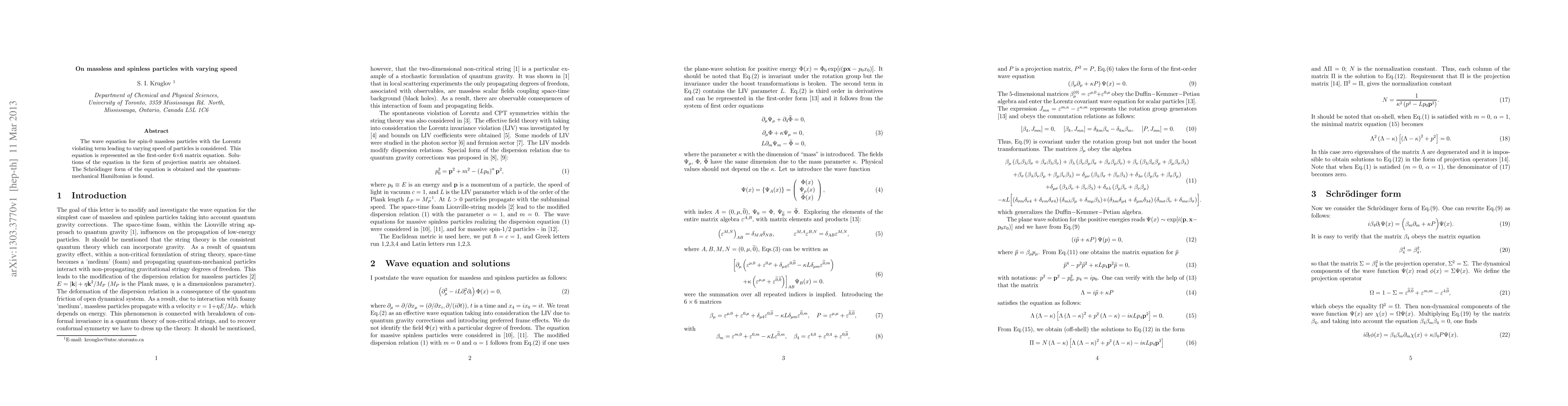 The wave equation for spin-0 massless particles with the Lorentz violating term leading to varying speed of particles is considered. This equation is represented as the first-order 6$\times$6 matrix equation. Solutions of the equation in the form of projection matrix are obtained. The Schr\"{o}dinger form of the equation is obtained and the quantum-mechanical Hamiltonian is found.