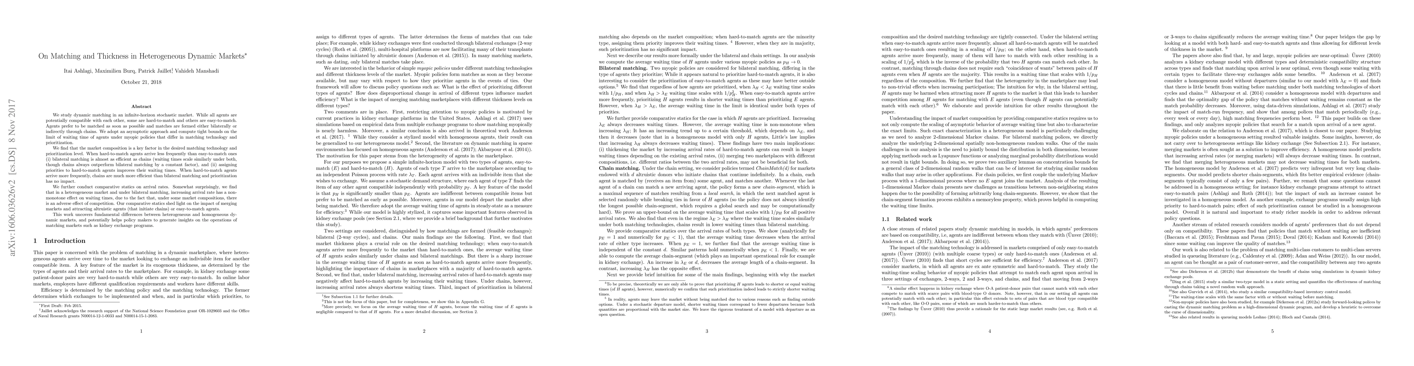 This paper examines dynamic matching in heterogeneous markets where agents vary in matchability, finding that market composition significantly influences optimal matching technology and prioritization. It shows that when hard-to-match agents arrive less frequently, bilateral matching is efficient, and prioritizing hard-to-match agents reduces waiting times, while chains are superior when they arrive more often. Comparative statics reveal non-monotonic effects of increased arrivals on waiting times in heterogeneous markets.
