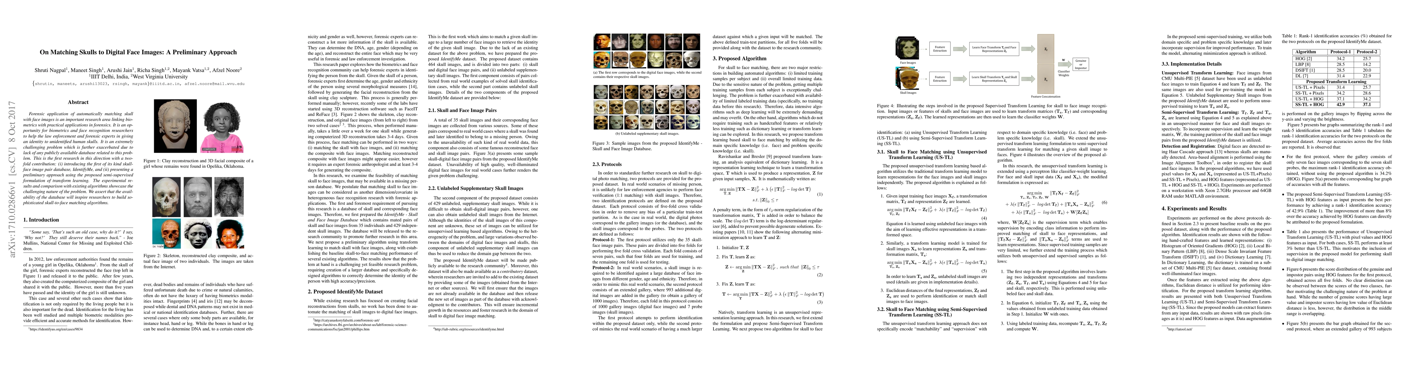 Forensic application of automatically matching skull with face images is an important research area linking biometrics with practical applications in forensics. It is an opportunity for biometrics and face recognition researchers to help the law enforcement and forensic experts in giving an identity to unidentified human skulls. It is an extremely challenging problem which is further exacerbated due to lack of any publicly available database related to this problem. This is the first research in this direction with a two-fold contribution: (i) introducing the first of its kind skull-face image pair database, IdentifyMe, and (ii) presenting a preliminary approach using the proposed semi-supervised formulation of transform learning. The experimental results and comparison with existing algorithms showcase the challenging nature of the problem. We assert that the availability of the database will inspire researchers to build sophisticated skull-to-face matching algorithms.