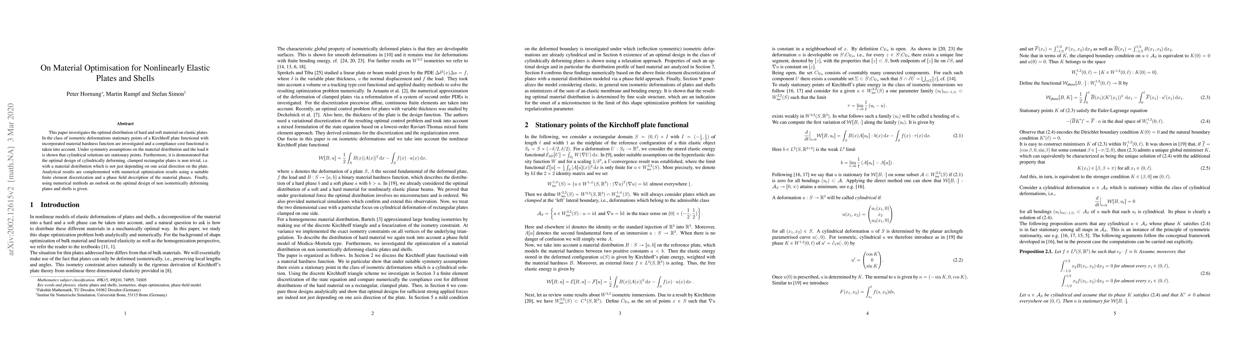 This paper explores the optimal material distribution in nonlinearly elastic plates, focusing on hard and soft materials under isometric deformations. It demonstrates that cylindrical solutions are stationary points and highlights that optimal designs for cylindrical deformations are complex, not merely axially dependent. Analytical and numerical methods, including finite element discretization, are used to support these findings.