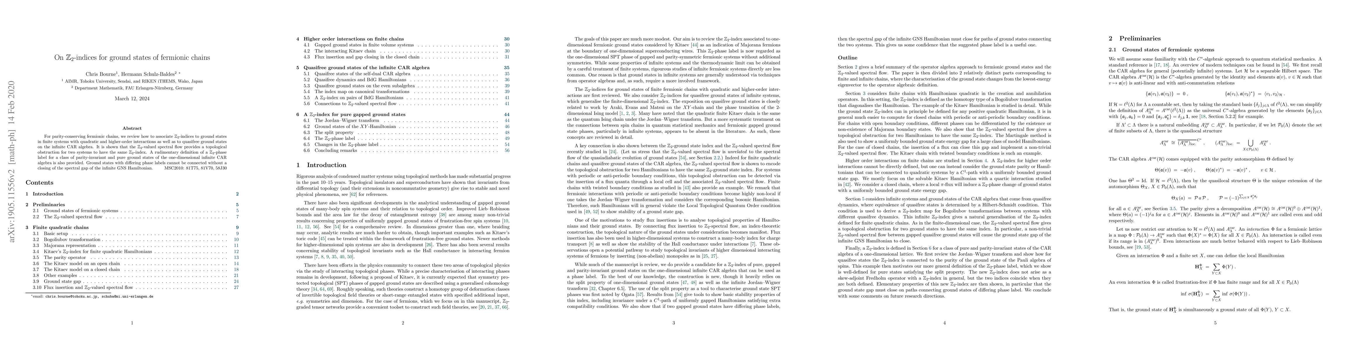 The paper reviews the assignment of $\mathbb{Z}_2$-indices to the ground states of parity-conserving fermionic chains, both in finite systems and infinite CAR algebra settings. It concludes that differing $\mathbb{Z}_2$-indices indicate a topological obstruction, and introduces a $\mathbb{Z}_2$-phase label that prevents ground states from being connected without closing the spectral gap.