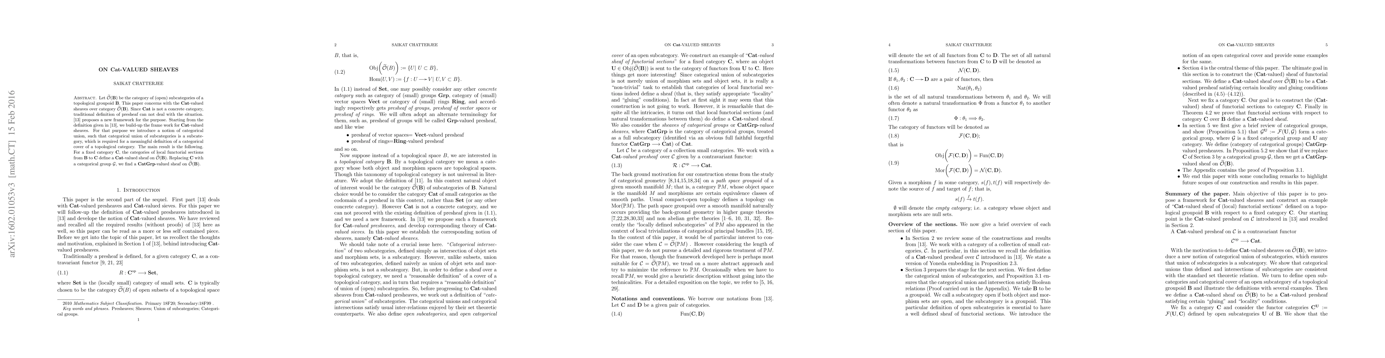 Let ${\widetilde {\mathcal O}}(\mathbf B)$ be the category of (open) subcategories of a topological groupoid ${\mathbf B}.$ This paper concerns with the ${\mathbf {Cat}}$-valued sheaves over category ${\widetilde {\mathcal O}}(\mathbf B).$ Since ${\mathbf {Cat}}$ is not a concrete category, traditional definition of presheaf can not deal with the situation. [13] proposes a new framework for the purpose. Starting from the definition given in [13], we build-up the frame work for ${\mathbf {Cat}}$-valued sheaves. For that purpose we introduce a notion of categorical union, such that categorical union of subcategories is a subcategory, which is required for a meaningful definition of a categorical cover of a topological category. The main result is the following. For a fixed category $\mathbf C,$ the categories of local functorial sections from $\mathbf B$ to $\mathbf C$ define a ${\mathbf {Cat}}$-valued sheaf on ${\widetilde {\mathcal O}}(\mathbf B).$ Replacing $\mathbf C$ with a categorical group $\mathcal G,$ we find a ${\mathbf {CatGrp}}$-valued sheaf on ${\widetilde {\mathcal O}}(\mathbf B).$