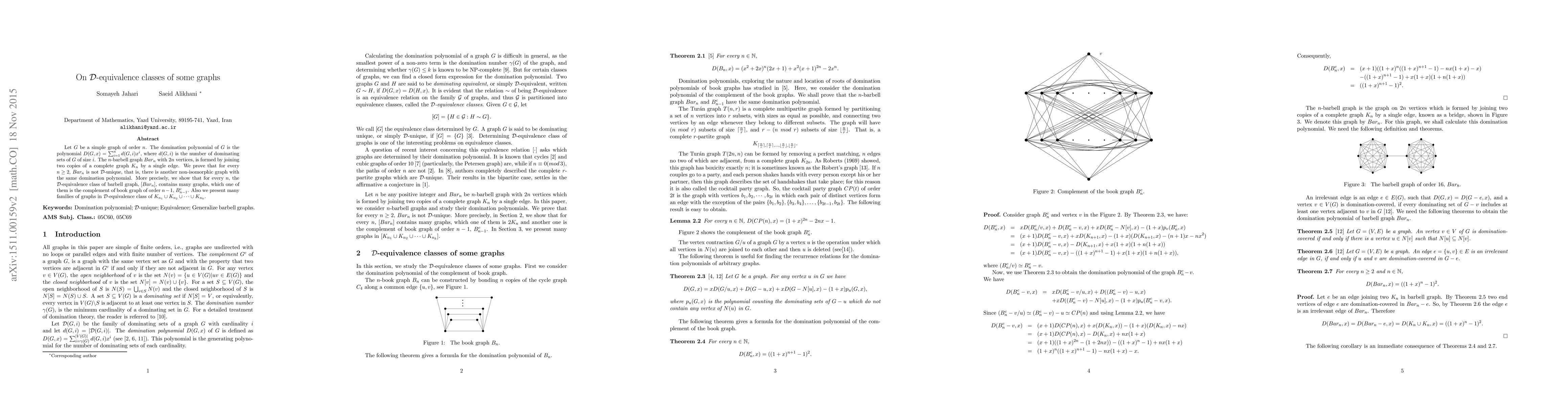 Summary: This paper investigates $\mathcal{D}$-equivalence classes of graphs, focusing on the domination polynomial of the $n$-barbell graph $Bar_n$. It demonstrates that $Bar_n$ is not $\mathcal{D}$-unique and includes numerous other non-isomorphic graphs in its $\mathcal{D}$-equivalence class, such as the complement of the book graph $B_{n-1}^c$. Additionally, it explores $\mathcal{D}$-equivalence classes for unions of complete graphs.