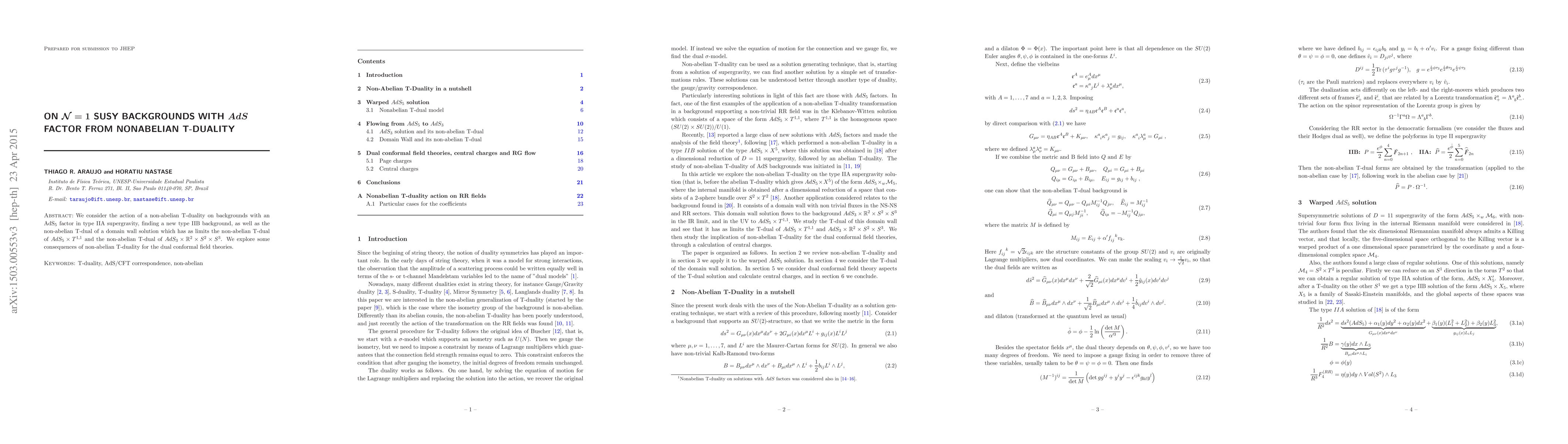 This paper examines the effects of non-abelian T-duality on type IIA supergravity backgrounds containing an AdS${}_5$ factor, discovering new IIB backgrounds and the T-dual of a domain wall solution, with implications for dual conformal field theories.