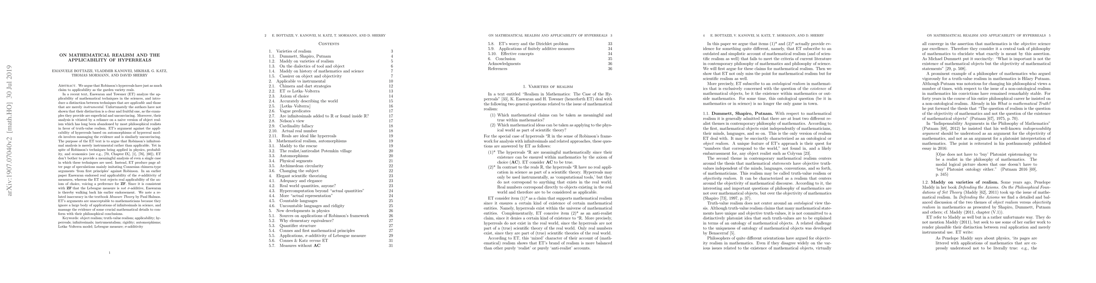 Researchers argue that Robinson's hyperreals have equal applicability to traditional reals in mathematics, challenging a distinction made by Easwaran and Towsner that has been criticized for being unclear and unconvincing.