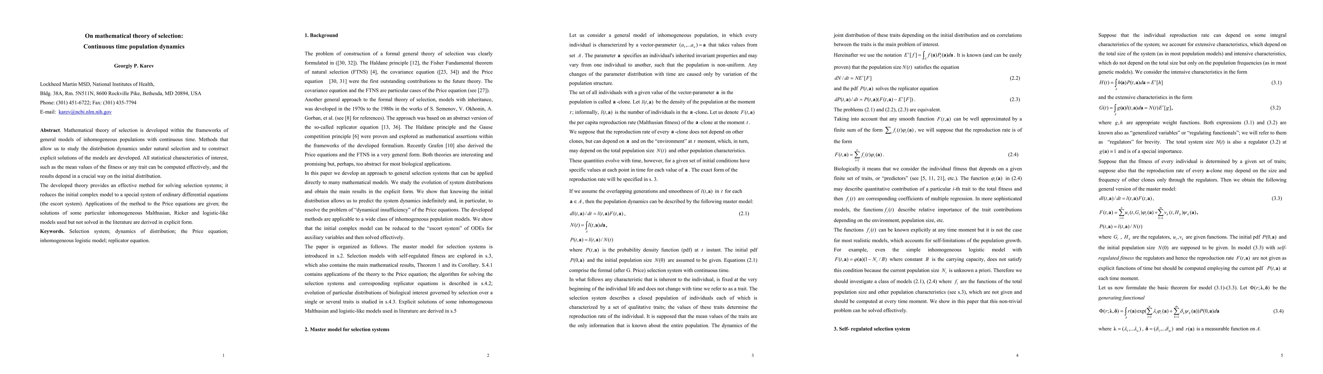 Mathematical theory of selection is developed within the frameworks of general models of inhomogeneous populations with continuous time. Methods that allow us to study the distribution dynamics under natural selection and to construct explicit solutions of the models are developed. All statistical characteristics of interest, such as the mean values of the fitness or any trait can be computed effectively, and the results depend in a crucial way on the initial distribution. The developed theory provides an effective method for solving selection systems; it reduces the initial complex model to a special system of ordinary differential equations (the escort system). Applications of the method to the Price equations are given; the solutions of some particular inhomogeneous Malthusian, Ricker and logistic-like models used but not solved in the literature are derived in explicit form.