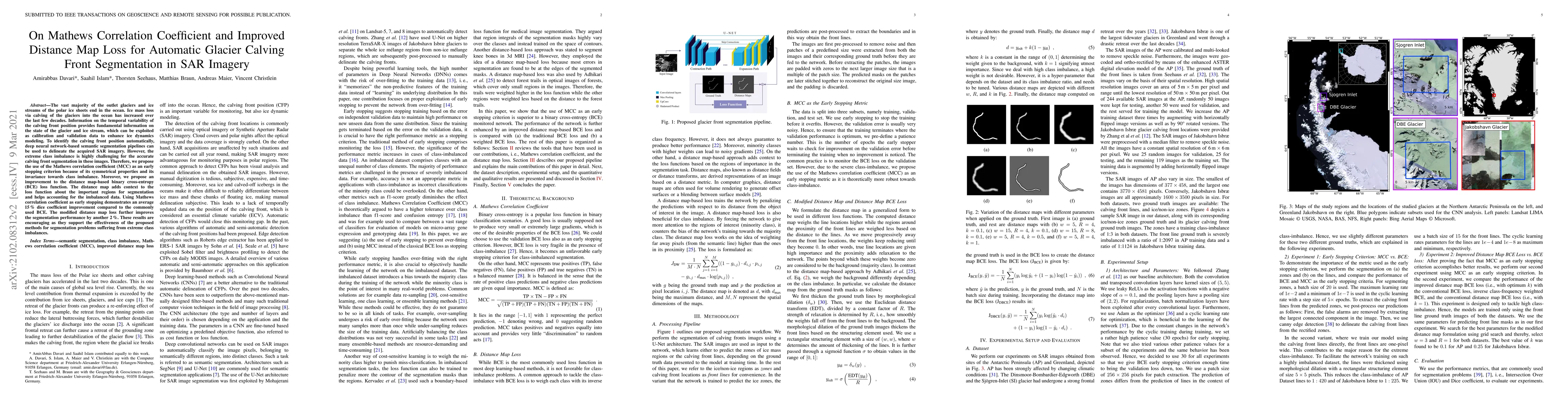 This paper proposes using the Mathews correlation coefficient (MCC) as an early stopping criterion and an improved distance map loss function to enhance automatic segmentation of glacier calving fronts in SAR imagery. The MCC addresses class imbalance issues, while the modified loss function provides better context for segmentation, resulting in a 15% improvement in dice coefficient and an additional 2% boost in performance.