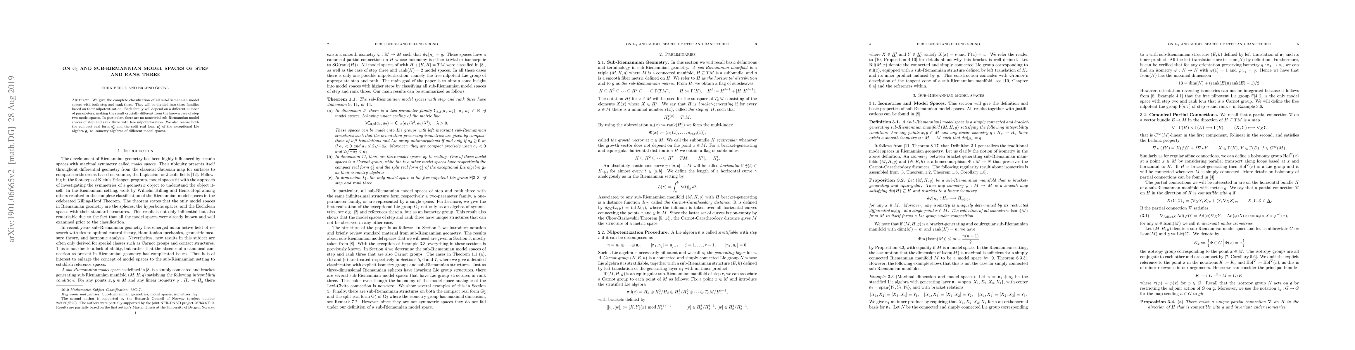 This paper classifies sub-Riemannian model spaces with step and rank three Lie algebras, finding that there are no nontrivial model spaces with free nilpotentization and realizing the compact and split real forms of $rak{g}_2$ as isometry algebras of different model spaces.
