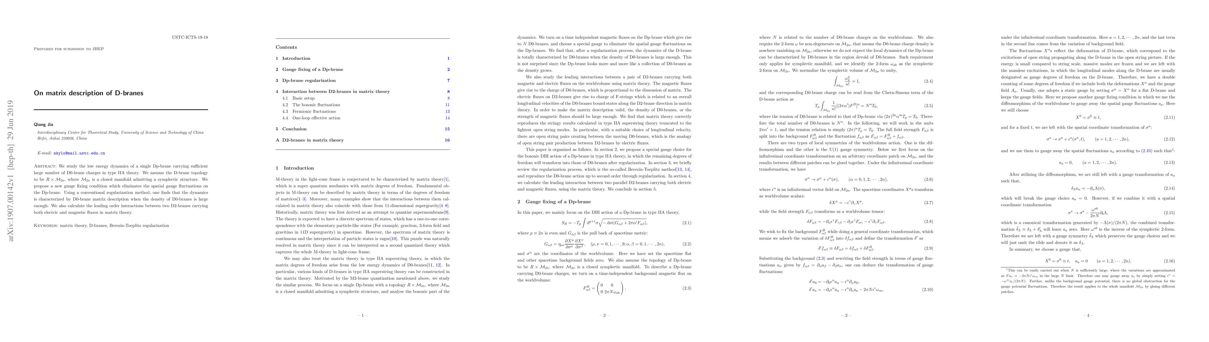 We study the low energy dynamics of a single Dp-brane carrying sufcient large number of D0-brane charges in type IIA theory. We assume the D-brane topology to be $R \times \mathcal{M}_{2n} $ , where $\mathcal{M}_{2n}$ is a closed manifold admitting a symplectic structure. We propose a new gauge fixing condition which eliminates the spatial gauge fluctuations on the Dp-brane. Using a conventional regularization method, one finds that the dynamics is characterized by D0-brane matrix description when the density of D0-branes is large enough. We also calculate the leading order interactions between two D2-branes carrying both electric and magnetic fluxes in matrix theory.