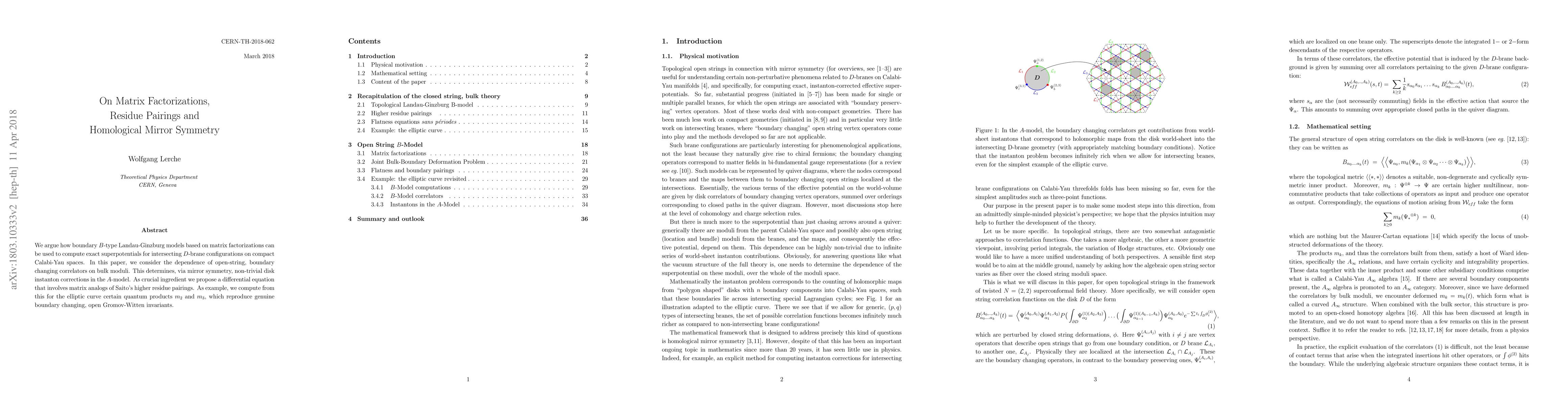 This paper explores how matrix factorizations and residue pairings in B-type Landau-Ginzburg models can determine exact superpotentials for D-brane configurations on Calabi-Yau spaces. It proposes a differential equation involving matrix analogs of higher residue pairings to compute disk instanton corrections, demonstrating the method with quantum products m_2 and m_3 for an elliptic curve.