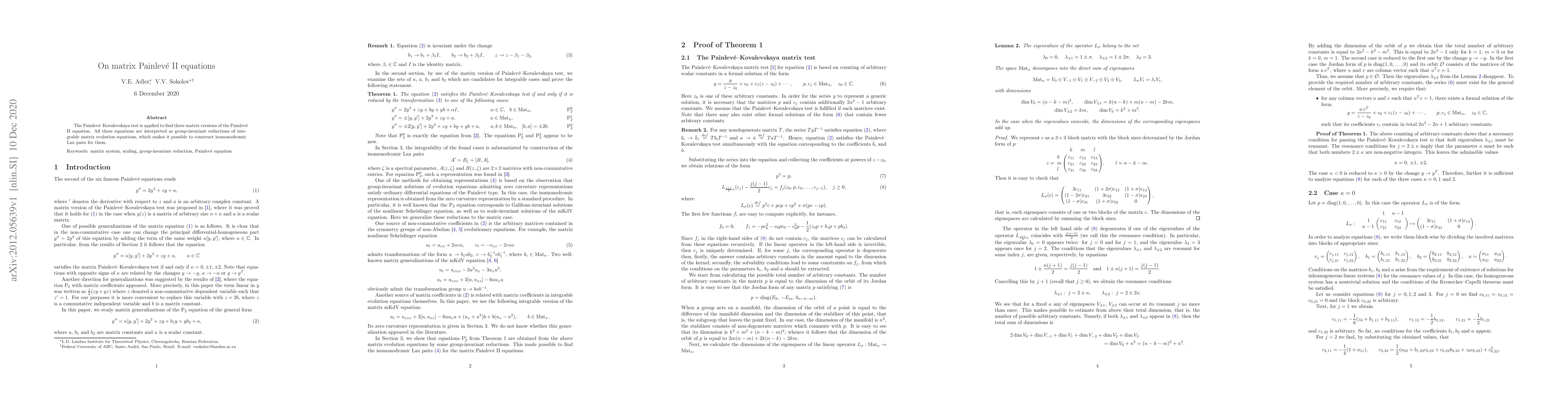 This paper applies the Painlevé-Kovalevskaya test to identify three matrix versions of the Painlevé II equation, interpreting them as group-invariant reductions of integrable matrix evolution equations, and constructs isomonodromic Lax pairs for these equations.