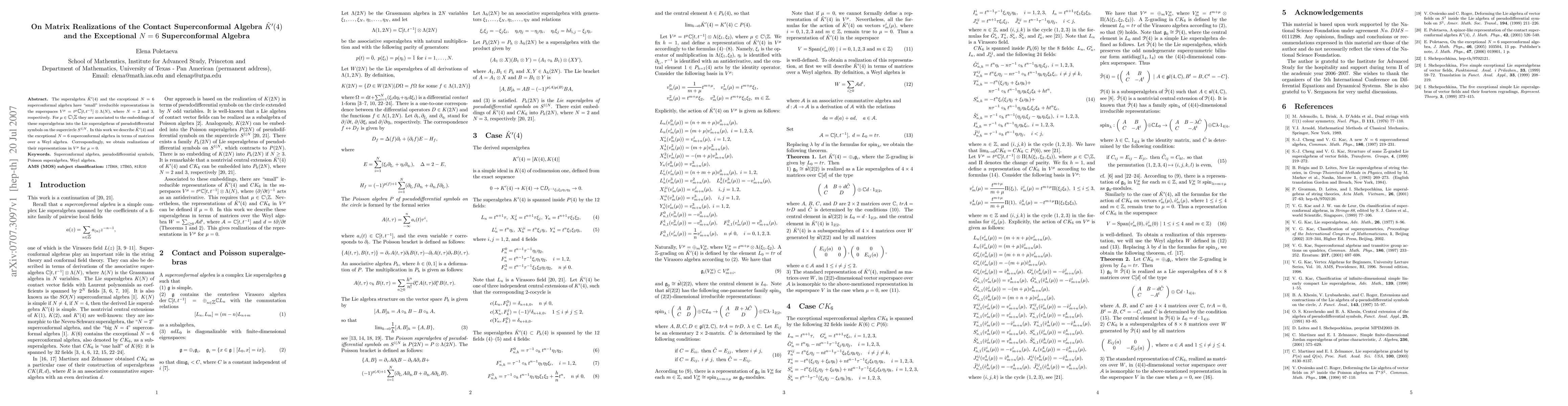 The superalgebra $\hat{K}'(4)$ and the exceptional N = 6 superconformal algebra have ``small'' irreducible representations in the superspaces $V^{\mu} = t^{\mu}\C[t, t^{-1}]\otimes\Lambda(N)$, where N = 2 and 3, respectively. For ${\mu \in \C\backslash \Z}$ they are associated to the embeddings of these superalgebras into the Lie superalgebras of pseudodifferential symbols on the supercircle S^{1|N}. In this work we describe $\hat{K}'(4)$ and the exceptional N = 6 superconformal algebra in terms of matrices over a Weyl algebra. Correspondingly, we obtain realizations of their representations in $V^{\mu}$ for $\mu = 0$.