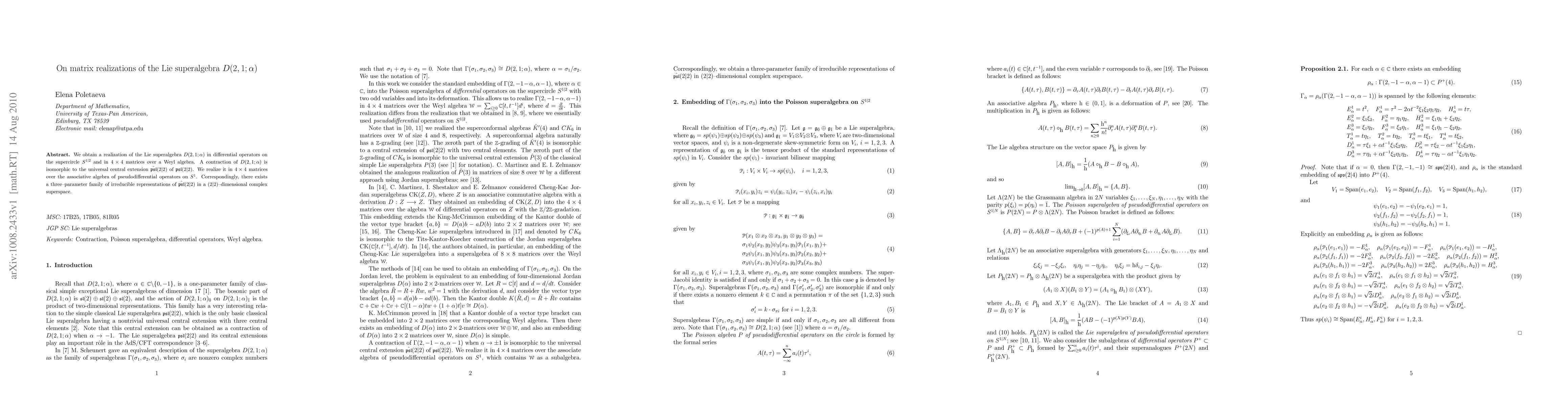 We obtain a realization of the Lie superalgebra $D(2, 1 ; \alpha)$ in differential operators on the supercircle $S^{1|2}$ and in $4\times 4$ matrices over a Weyl algebra. A contraction of $D(2, 1 ; \alpha)$ is isomorphic to the universal central extension $\hat{\p\s\l}(2|2)$ of $\p\s\l(2|2)$. We realize it in $4\times 4$ matrices over the associative algebra of pseudodifferential operators on $S^1$. Correspondingly, there exists a three-parameter family of irreducible representations of $\hat{\p\s\l}(2|2)$ in a $(2|2)$--dimensional complex superspace.