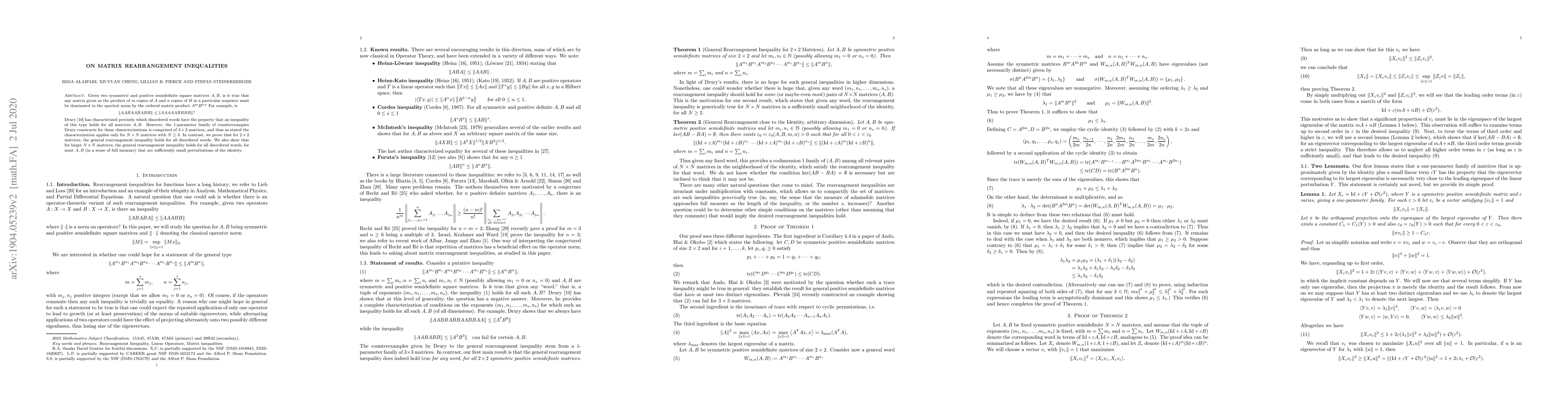 Given two symmetric and positive semidefinite square matrices $A, B$, is it true that any matrix given as the product of $m$ copies of $A$ and $n$ copies of $B$ in a particular sequence must be dominated in the spectral norm by the ordered matrix product $A^m B^n$? For example, is $$ \| AABAABABB \| \leq \| AAAAABBBB \|\ ? $$ Drury has characterized precisely which disordered words have the property that an inequality of this type holds for all matrices $A,B$. However, the $1$-parameter family of counterexamples Drury constructs for these characterizations is comprised of $3 \times 3$ matrices, and thus as stated the characterization applies only for $N \times N$ matrices with $N \geq 3$. In contrast, we prove that for $2 \times 2$ matrices, the general rearrangement inequality holds for all disordered words. We also show that for larger $N \times N$ matrices, the general rearrangement inequality holds for all disordered words, for most $A,B$ (in a sense of full measure) that are sufficiently small perturbations of the identity.