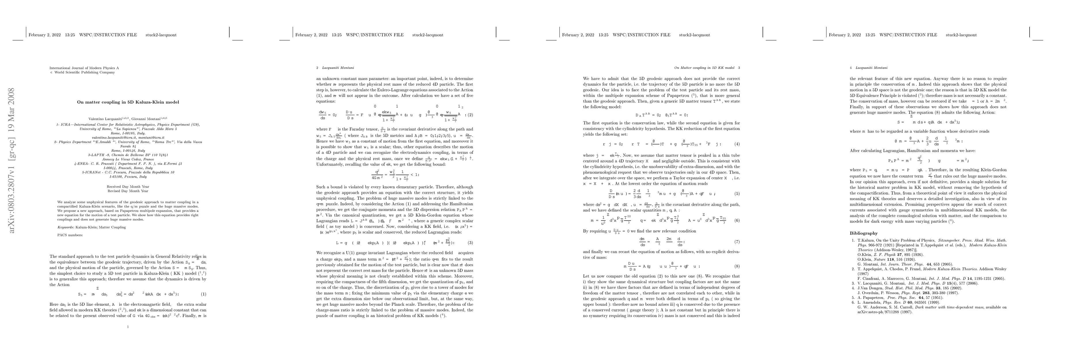 We analyze some unphysical features of the geodesic approach to matter coupling in a compactified Kaluza-Klein scenario, like the q/m puzzle and the huge massive modes. We propose a new approach, based on Papapetrou multipole expansion, that provides a new equation for the motion of a test particle. We show how this equation provides right couplings and does not generate huge massive modes.