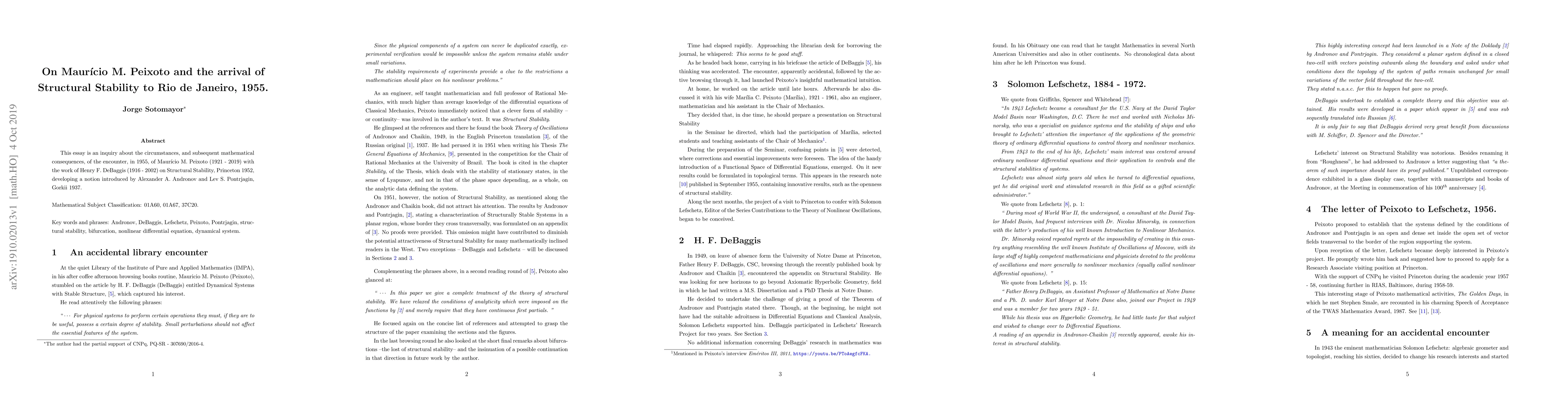 This essay is an inquiry about the circumstances, and subsequent mathematical consequences, of the encounter, in 1955, of Maur\'icio M. Peixoto (1921 - 2019) with the work of Henry F. DeBaggis (1916 - 2002) on Structural Stability, Princeton 1952, developing a notion introduced by Alexander A. Andronov and Lev S. Pontrjagin, Gorkii 1937.