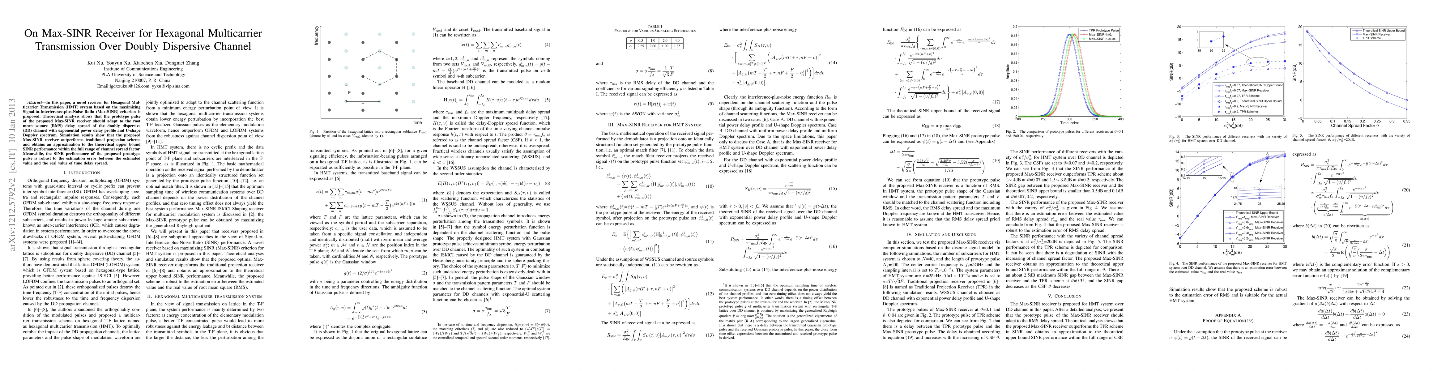 In this paper, a novel receiver for Hexagonal Multicarrier Transmission (HMT) system based on the maximizing Signal-to-Interference-plus-Noise Ratio (Max-SINR) criterion is proposed. Theoretical analysis shows that the prototype pulse of the proposed Max-SINR receiver should adapt to the root mean square (RMS) delay spread of the doubly dispersive (DD) channel with exponential power delay profile and U-shape Doppler spectrum. Simulation results show that the proposed Max-SINR receiver outperforms traditional projection scheme and obtains an approximation to the theoretical upper bound SINR performance within the full range of channel spread factor. Meanwhile, the SINR performance of the proposed prototype pulse is robust to the estimation error between the estimated value and the real value of time delay spread.