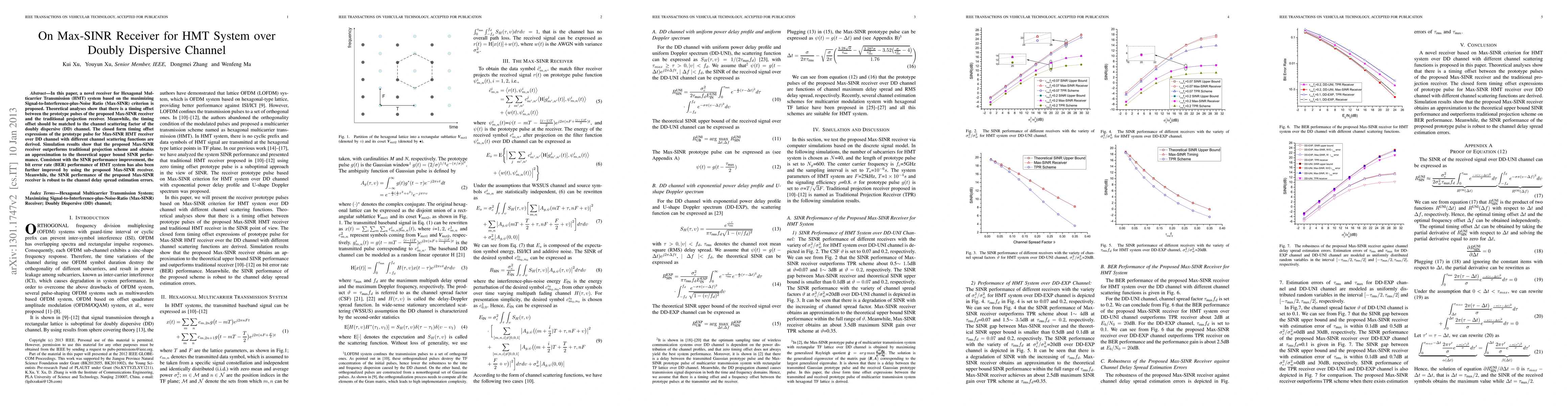 This paper proposes a novel Max-SINR receiver for Hexagonal Multicarrier Transmission (HMT) systems, demonstrating improved Signal-to-Interference-plus-Noise Ratio (SINR) and bit error rate (BER) performance over doubly dispersive channels compared to traditional projection receivers. The study also derives closed-form expressions for timing offset and shows robustness to channel delay spread estimation errors.