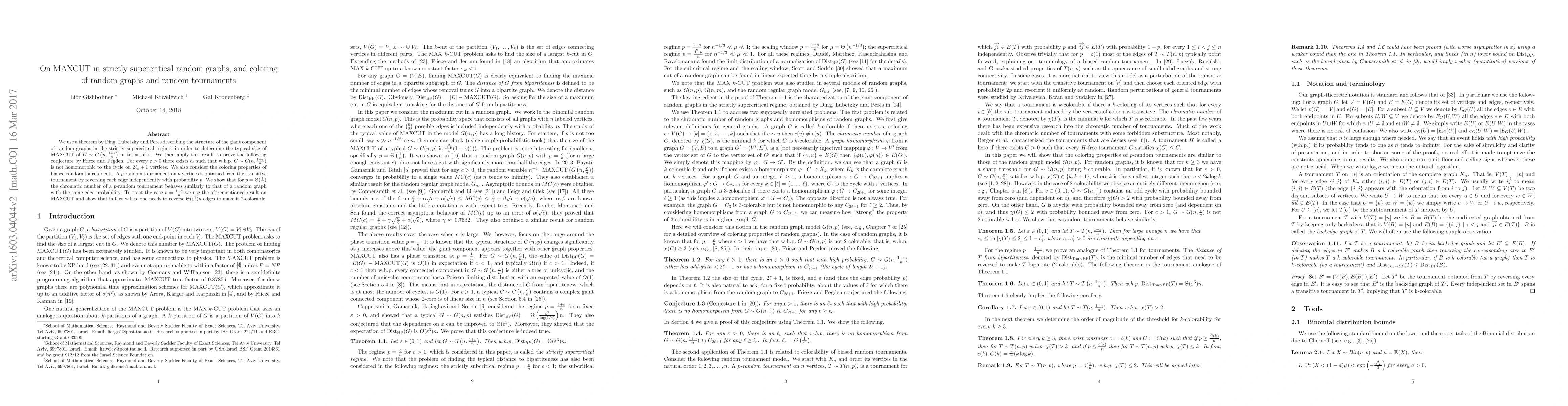 We use a theorem by Ding, Lubetzky and Peres describing the structure of the giant component of random graphs in the strictly supercritical regime, in order to determine the typical size of MAXCUT of $G\sim G\left(n,\frac {1+\varepsilon}n\right)$ in terms of $\varepsilon$. We then apply this result to prove the following conjecture by Frieze and Pegden. For every $\varepsilon>0$ there exists $\ell_\varepsilon$ such that \whp $G\sim G(n,\frac {1+\varepsilon}n)$ is not homomorphic to the cycle on $2\ell_\varepsilon+1$ vertices. We also consider the coloring properties of biased random tournaments. A $p$-random tournament on $n$ vertices is obtained from the transitive tournament by reversing each edge independently with probability $p$. We show that for $p=\Theta(\frac 1n)$ the chromatic number of a $p$-random tournament behaves similarly to that of a random graph with the same edge probability. To treat the case $p=\frac {1+\varepsilon}n$ we use the aforementioned result on MAXCUT.