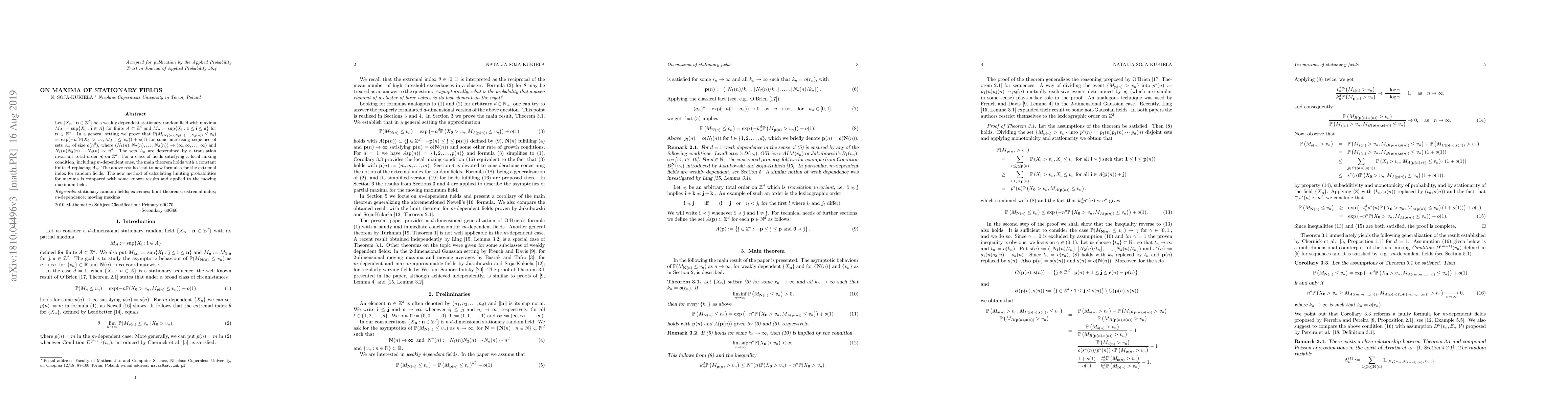 This research paper proves that for certain types of stationary fields with maxima, the probability of the maximum value within a large cube being less than or equal to a given value is related to the probability of exceeding that value at a smaller scale, leading to new formulas for the extremal index.