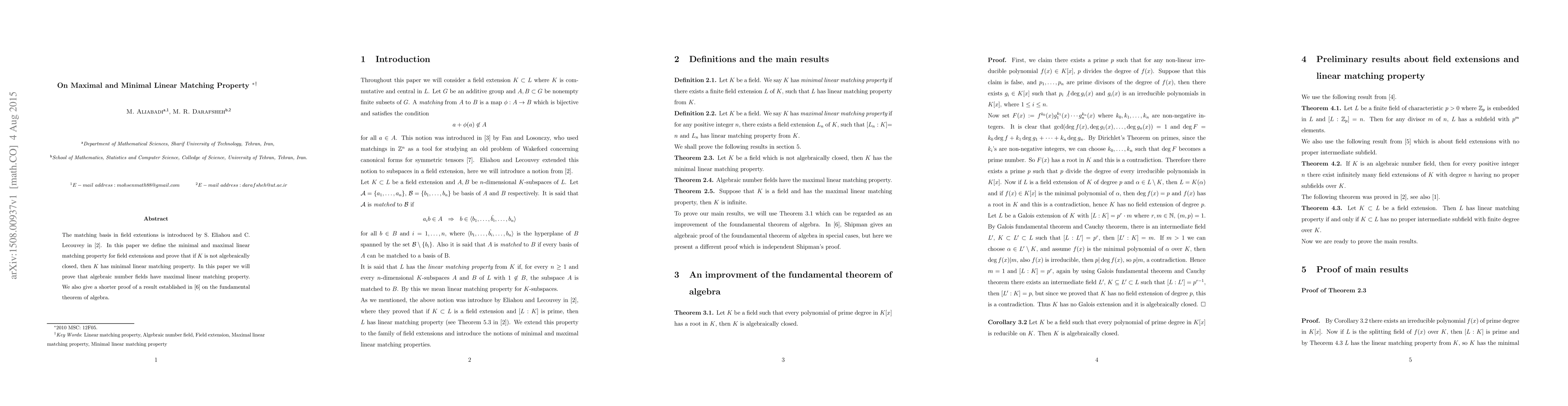 The matching basis in field extentions is introduced by S. Eliahou and C. Lecouvey in [2]. In this paper we define the minimal and maximal linear matching property for field extensions and prove that if K is not algebraically closed, then K has minimal linear matching property. In this paper we will prove that algebraic number fields have maximal linear matching property. We also give a shorter proof of a result established in [6] on the fundamental theorem of algebra.