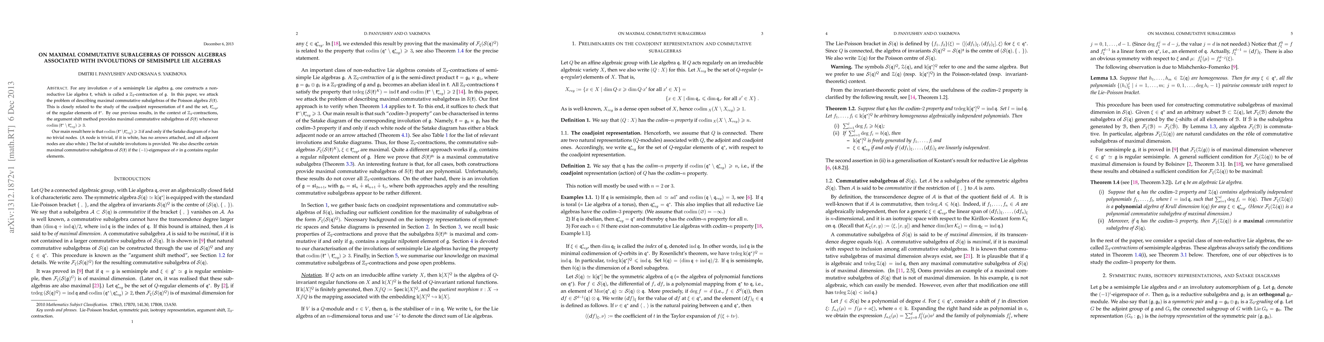 For any involution $\sigma$ of a semisimple Lie algebra $\mathfrak g$, one constructs a non-reductive Lie algebra $\mathfrak k$, which is called a $\mathbb Z_2$-contraction of $\mathfrak g$. In this paper, we attack the problem of describing maximal commutative subalgebras of the Poisson algebra $S(\mathfrak k)$. This is closely related to the study of the coadjoint representation of $\mathfrak k$ and the set, $\mathfrak k^*_{reg}$, of the regular elements of $\mathfrak k^*$. By our previous results, in the context of $\mathbb Z_2$-contractions, the argument shift method provides maximal commutative subalgebras of $S(\mathfrak k)$ whenever $codim(\mathfrak k^* \setminus \mathfrak k^*_{reg})\ge 3$. Our main result here is that $codim(\mathfrak k^* \setminus \mathfrak k^*_{reg})\ge 3$ if and only if the Satake diagram of $\sigma$ has no trivial nodes. (A node is trivial, if it is white, has no arrows attached, and all adjacent nodes are also white.) The list of suitable involutions is provided. We also describe certain maximal commutative subalgebras of $S(\mathfrak k)$ if the (-1)-eigenspace of $\sigma$ in $\mathfrak g$ contains regular elements.