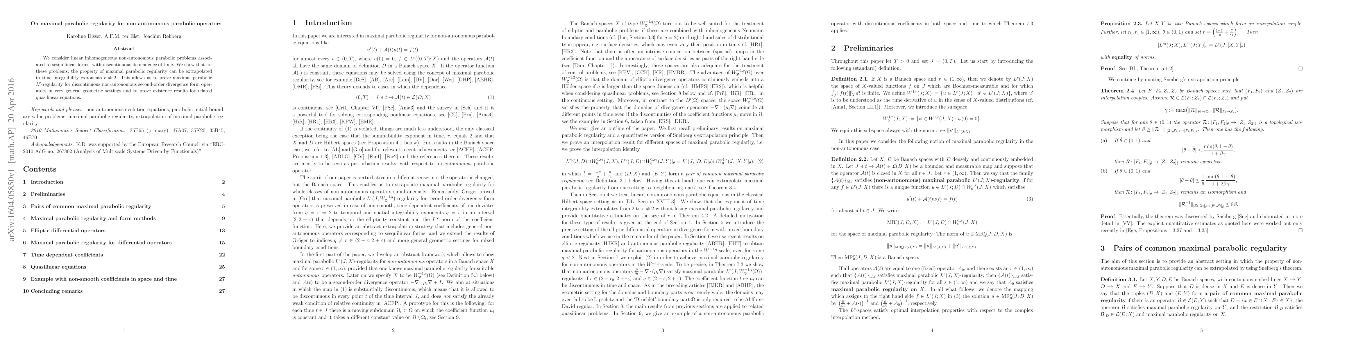 This paper demonstrates maximal parabolic regularity for non-autonomous parabolic operators under discontinuous time dependence, extending the property to $L^r$ spaces for $r\neq 2$. It establishes $L^r$-regularity for discontinuous non-autonomous second-order divergence form operators and proves existence results for related quasilinear equations.