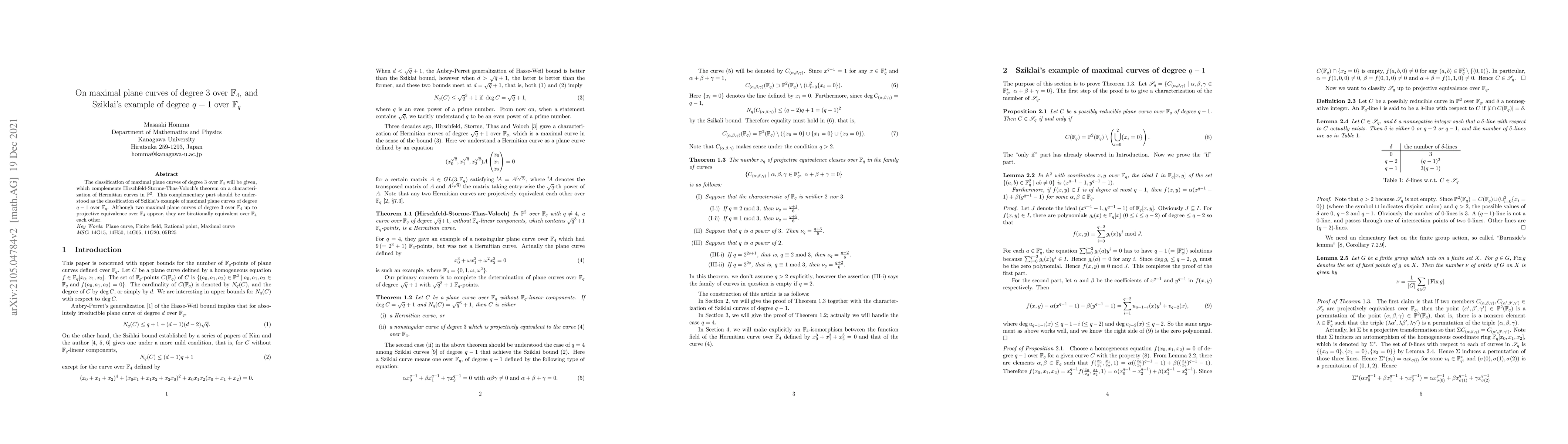 Summary: The paper classifies maximal plane curves of degree 3 over $\mathbb{F}_4$, complementing a theorem on Hermitian curves, and explores Sziklai's example for maximal plane curves of degree $q-1$ over $\mathbb{F}_q$, finding two projectively distinct but birationally equivalent curves over $\mathbb{F}_4$.