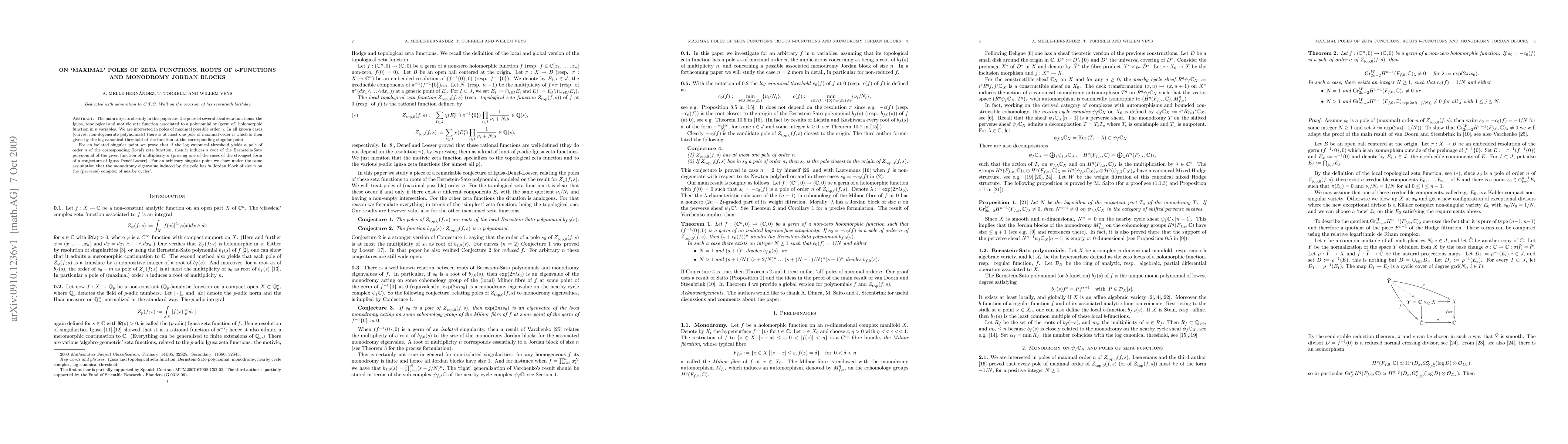 Researchers investigate the poles of zeta functions and their relation to roots of Bernstein-Sato polynomials and Jordan blocks in monodromy eigenvalues at singular points.