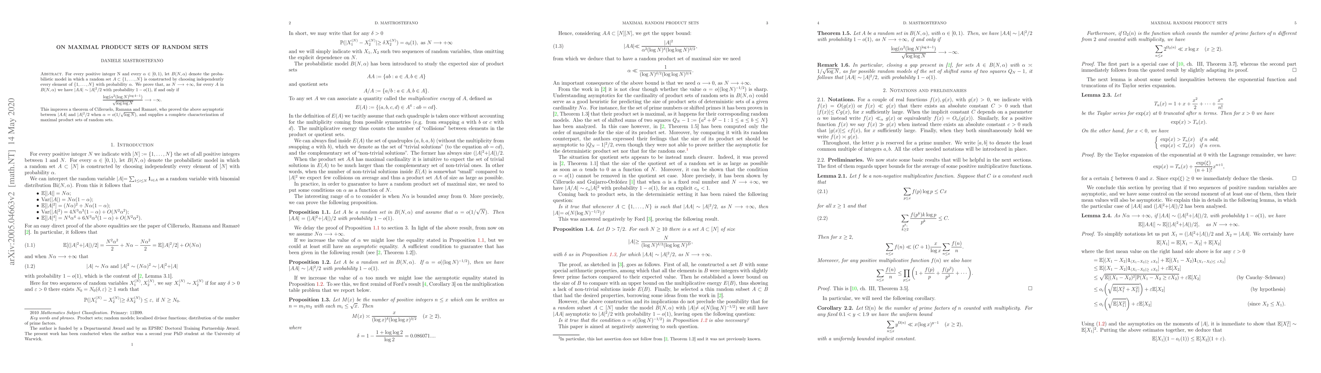 The paper studies random sets of elements and finds that the size of their product sets follows a specific asymptotic behavior, which improves an existing theorem. It provides a complete characterization of maximal product sets of random sets as N approaches infinity.