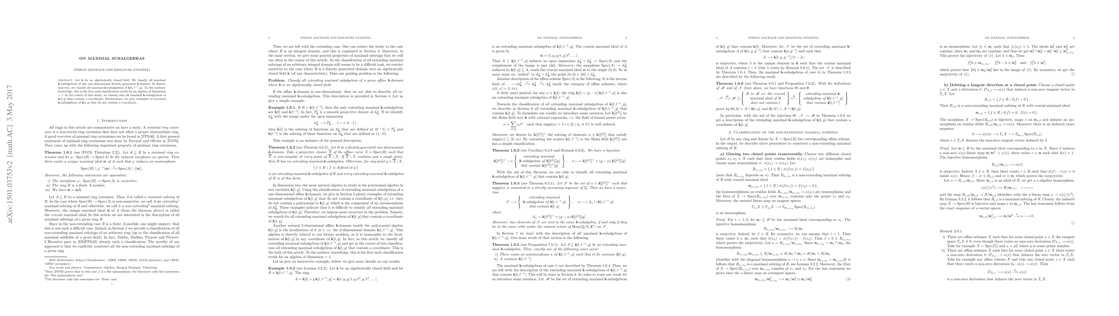 Researchers classify maximal subalgebras in one-dimensional finitely generated fields and a specific algebra of dimension 2, providing the first such classification for dimensions greater than 1.