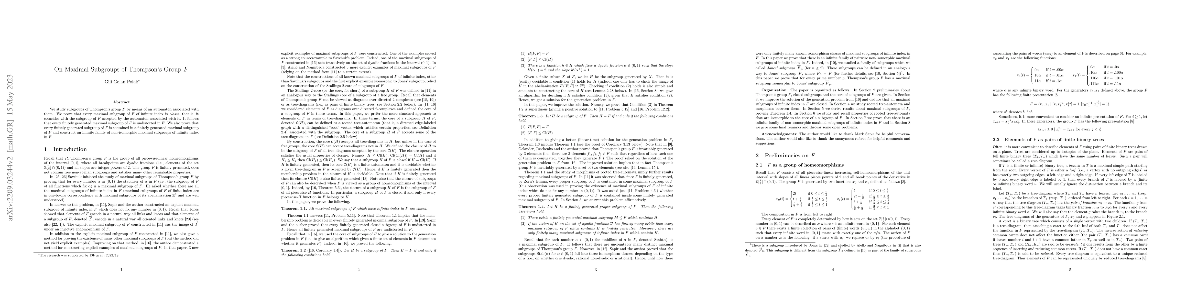This paper investigates Thompson's group $F$ and its maximal subgroups using associated automata, proving that every maximal subgroup of infinite index is closed and undistorted. It also demonstrates that every finitely generated subgroup is contained within a maximal subgroup and constructs an infinite family of non-isomorphic maximal subgroups.
