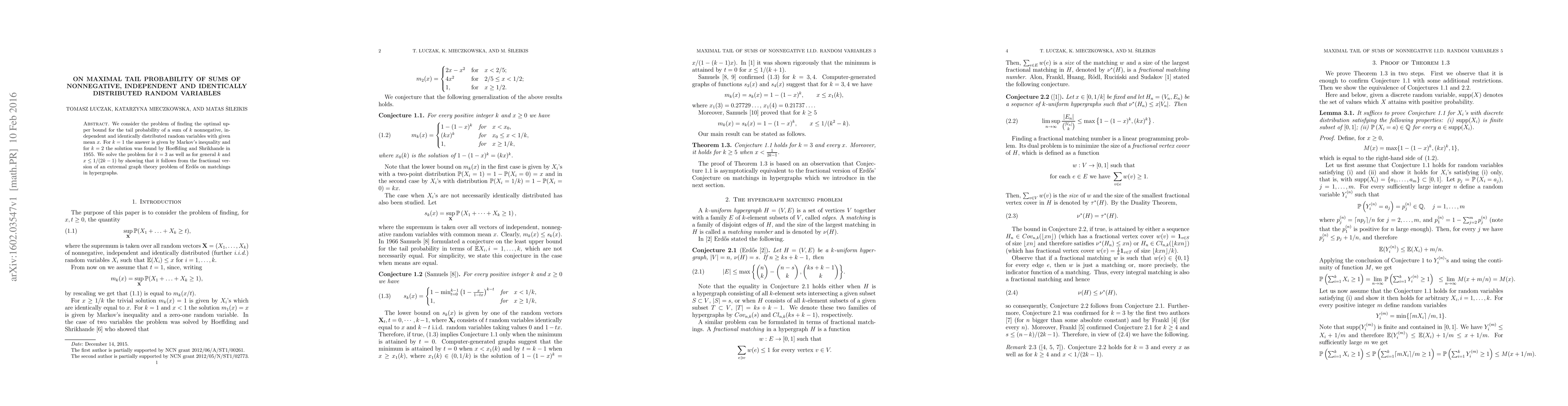 This research paper solves the problem of finding an optimal upper bound for the tail probability of sums of nonnegative, independent, and identically distributed random variables. It finds a general solution for k=3 and more, using extremal graph theory, with implications for understanding rare events in statistics.