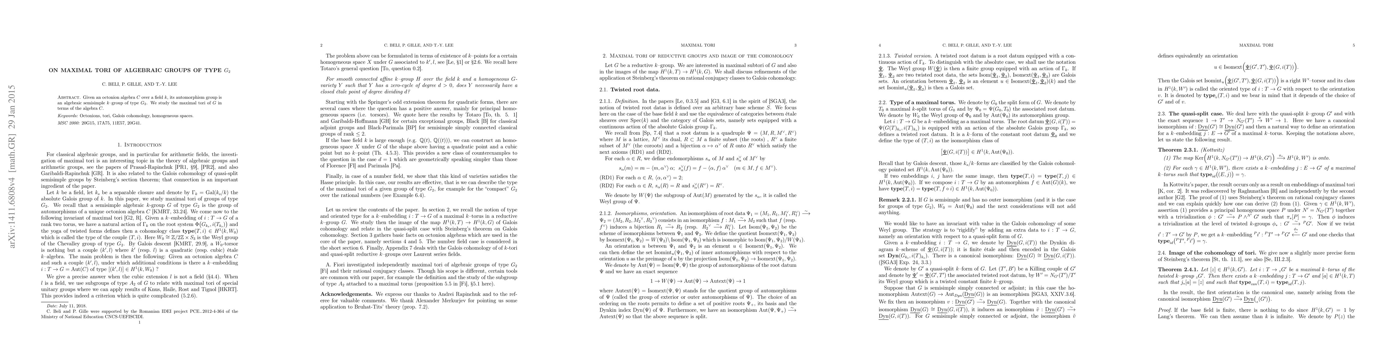 This paper investigates the maximal tori of the algebraic semisimple group G_2, which is the automorphism group of an octonion algebra over a field k. The study focuses on how these maximal tori relate to the complex algebra C.