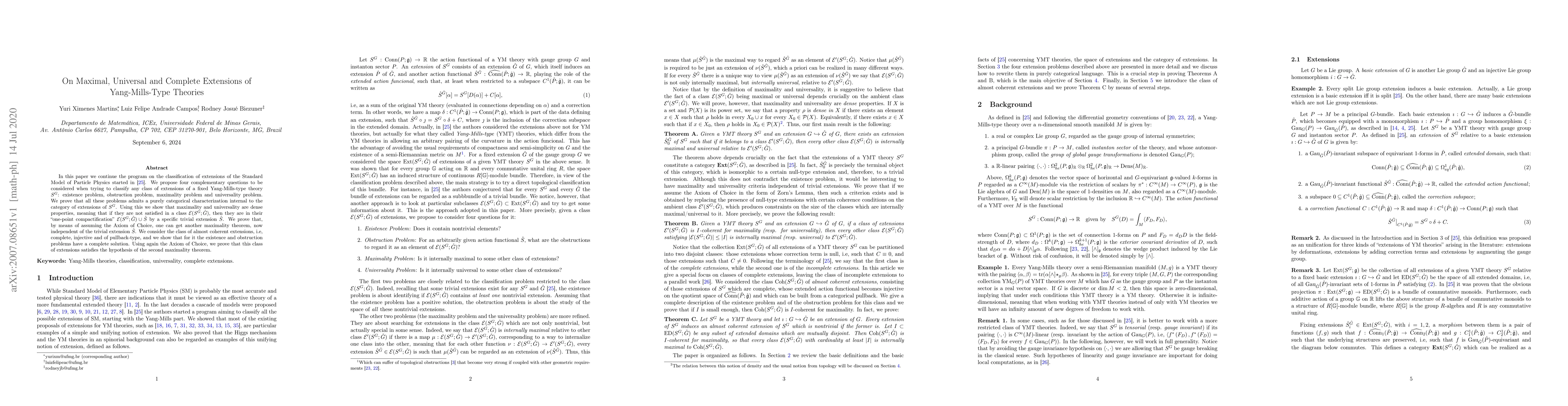 In this paper we continue the program on the classification of extensions of the Standard Model of Particle Physics started in arXiv:2007.01660. We propose four complementary questions to be considered when trying to classify any class of extensions of a fixed Yang-Mills-type theory $S^G$: existence problem, obstruction problem, maximality problem and universality problem. We prove that all these problems admits a purely categorical characterization internal to the category of extensions of $S^G$. Using this we show that maximality and universality are dense properties, meaning that if they are not satisfied in a class $\mathcal{E}(S^G;\hat{G})$, then they are in their "one-point compactification" $\mathcal{E}(S^G;\hat{G})\cup \hat{S}$ by a specific trivial extension $\hat{S}$. We prove that, by means of assuming the Axiom of Choice, one can get another maximality theorem, now independent of the trivial extension $\hat{S}$. We consider the class of almost coherent extensions, i.e, complete, injective and of pullback-type, and we show that for it the existence and obstruction problems have a complete solution. Using again the Axiom of Choice, we prove that this class of extensions satisfies the hypothesis of the second maximality theorem.