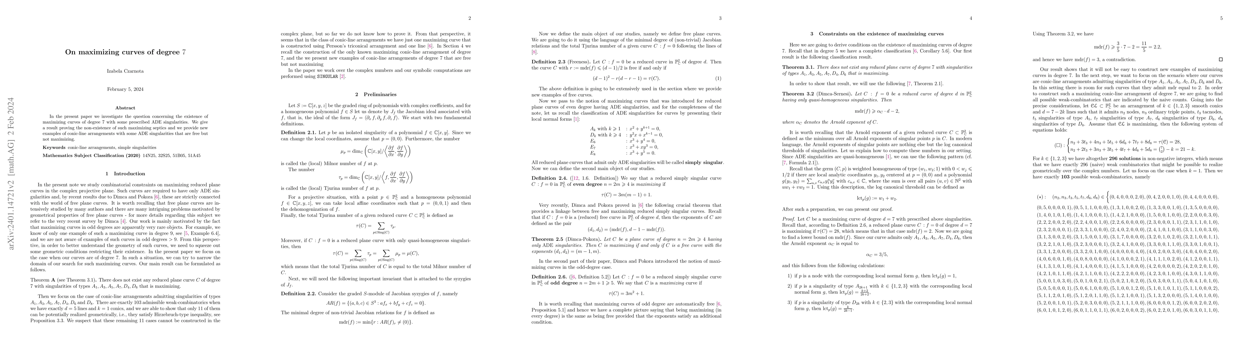 This paper proves that there are no maximizing curves of degree 7 with prescribed ADE singularities, and presents new examples of conic-line arrangements with ADE singularities that are free but not maximizing.