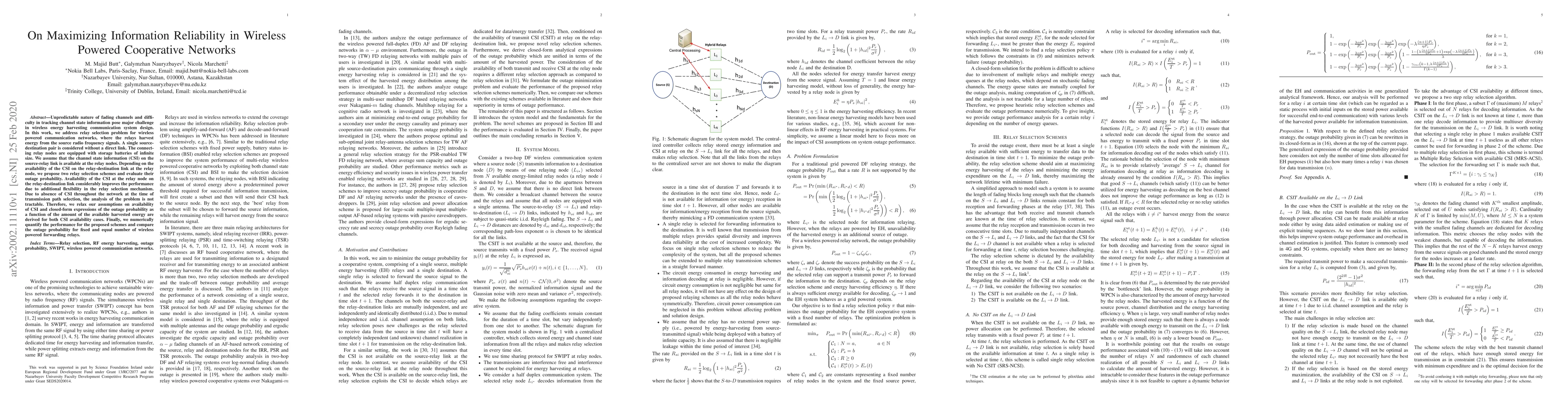 This paper proposes two relay selection schemes for wireless powered cooperative networks to maximize information reliability, addressing the challenge of fading channels. The schemes evaluate outage probability based on the availability of channel state information, deriving closed-form expressions for both scenarios and comparing performance with a fixed number of relays.